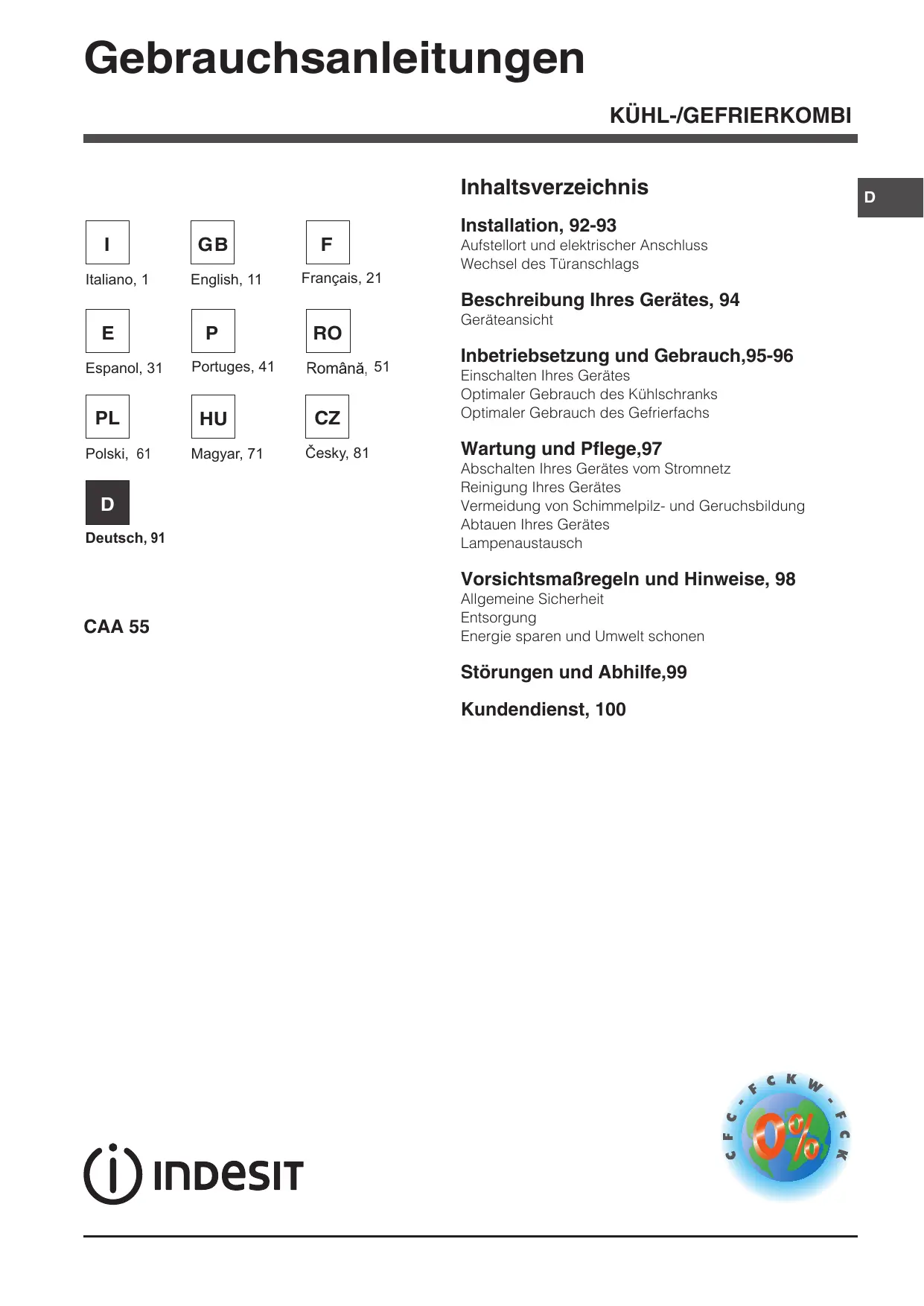 BEDIENUNGSANLEITUNG CAA 55, CAA 55 NX, CAA55, CAA55, CAA55, CAA55NX INDESIT