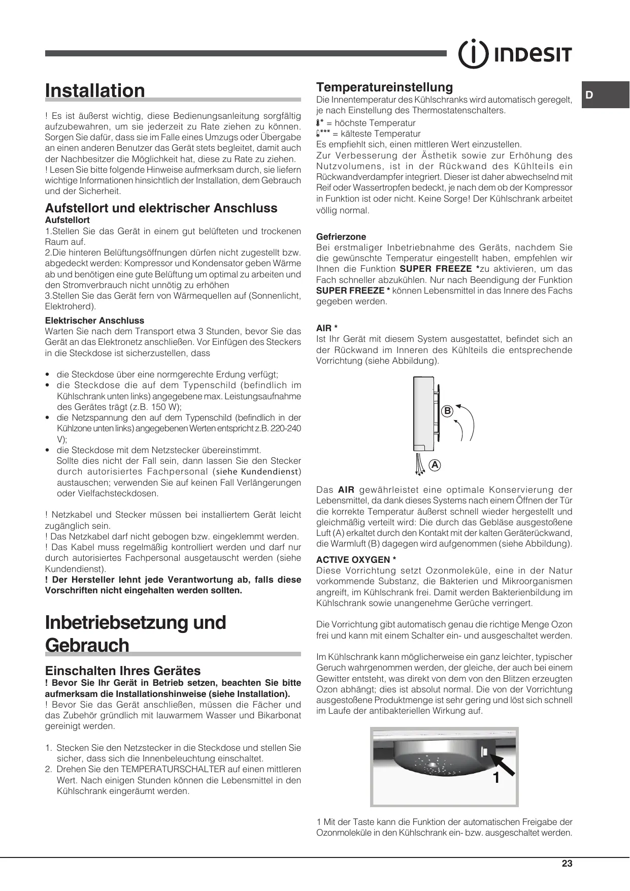 B A Das AIR gewährleistet eine optimale Konservierung der Lebensmittel, da dank dieses Systems nach einem Öffnen der Tür die korrekte Temperatur äußerst schnell wieder hergestellt und gleichmäßig verteilt wird: Die durch das Gebläse ausgestoßene Luft (A) erkaltet durch den Kontakt mit der kalten Geräterückwand, die Warmluft (B) dagegen wird aufgenommen (siehe Abbildung). ACTIVE OXYGEN * Diese Vorrichtung setzt Ozonmoleküle, eine in der Natur vorkommende Substanz, die Bakterien und Mikroorganismen angreift, im Kühlschrank frei. Damit werden Bakterienbildung im Kühlschrank sowie unangenehme Gerüche verringert. Die Vorrichtung gibt automatisch genau die richtige Menge Ozon frei und kann mit einem Schalter ein- und ausgeschaltet werden. Im Kühlschrank kann möglicherweise ein ganz leichter, typischer Geruch wahrgenommen werden, der gleiche, der auch bei einem Gewitter entsteht, was direkt von dem von den Blitzen erzeugten Ozon abhängt; dies ist absolut normal. Die von der Vorrichtung ausgestoßene Produktmenge ist sehr gering und löst sich schnell im Laufe der antibakteriellen Wirkung auf.