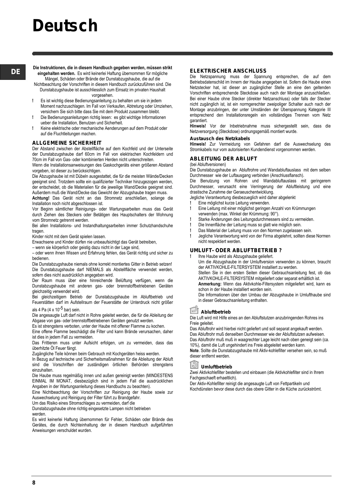 Die Instruktionen, die in diesem Handbuch gegeben werden, müssen strikt eingehalten werden. Es wird keinerlei Haftung übernommen für mögliche Mängel, Schäden oder Brände der Dunstabzugshaube, die auf die Nichtbeachtung der Vorschriften in diesem Handbuch zurückzuführen sind. Die Dunstabzugshaube ist ausschliesslich zum Einsatz im privaten Haushalt vorgesehen. Es ist wichtig diese Bedienungsanleitung zu behalten um sie in jedem Moment nachzuschlagen. Im Fall von Verkaufen, Abtretung oder Umziehen, versichern Sie sich bitte dass Sie mit dem Produkt zusammen bleibt. Die Bedienungsanleitungen richtig lesen: es gibt wichtige Informationen ueber die Installation, Benutzen und Sicherheit. Keine elektrische oder mechanische Aenderungen auf dem Produkt oder auf die Fluchtleitungen machen. ALLGEMEINE SICHERHEIT Der Abstand zwischen der Abstellfläche auf dem Kochfeld und der Unterseite der Dunstabzugshaube darf 60cm im Fall von elektrischen Kochfeldern und 70cm im Fall von Gas- oder kombinierten Herden nicht unterschreiten. Wenn die Installationsanweisungen des Gaskochgeräts einen größeren Abstand vorgeben, ist dieser zu berücksichtigen. Die Abzugshaube ist mit Dübeln ausgestattet, die für die meisten Wände/Decken geeignet sind. Trotzdem sollte ein qualifizierter Techniker hinzugezogen werden, der entscheidet, ob die Materialien für die jeweilige Wand/Decke geeignet sind. Außerdem muß die Wand/Decke das Gewicht der Abzugshaube tragen muss. Achtung! Das Gerät nicht an das Stromnetz anschließen, solange die Installation noch nicht abgeschlossen ist. Vor Beginn sämtlicher Reinigungs- oder Wartungsarbeiten muss das Gerät durch Ziehen des Steckers oder Betätigen des Hauptschalters der Wohnung vom Stromnetz getrennt werden. Bei allen Installations- und Instandhaltungsarbeiten immer Schutzhandschuhe tragen. Kinder nicht mit dem Gerät spielen lassen. Erwachsene und Kinder dürfen nie unbeaufsichtigt das Gerät betreiben, – wenn sie körperlich oder geistig dazu nicht in der Lage sind, – oder wenn ihnen Wissen und Erfahrung fehlen, das Gerät richtig und sicher zu bedienen. Die Dunstabzugshaube niemals ohne korrekt montiertes Gitter in Betrieb setzen! Die Dunstabzugshaube darf NIEMALS als Abstellfläche verwendet werden, sofern dies nicht ausdrücklich angegeben wird. Der Raum muss über eine hinreichende Belüftung verfügen, wenn die Dunstabzugshaube mit anderen gas- oder brennstoffbetriebenen Geräten gleichzeitig verwendet wird. Bei gleichzeitigem Betrieb der Dunstabzugshaube im Abluftbetrieb und Feuerstätten darf im Aufstellraum der Feuerstätte der Unterdruck nicht größer als 4 Pa (4 x 10-5 bar) sein. Die angesaugte Luft darf nicht in Rohre geleitet werden, die für die Ableitung der Abgase von gas- oder brennstoffbetriebenen Geräten genutzt werden. Es ist strengstens verboten, unter der Haube mit offener Flamme zu kochen. Eine offene Flamme beschädigt die Filter und kann Brände verursachen, daher ist dies in jedem Fall zu vermeiden. Das Frittieren muss unter Aufsicht erfolgen, um zu vermeiden, dass das überhitzte Öl Feuer fängt. Zugängliche Teile können beim Gebrauch mit Kochgeräten heiss werden. In Bezug auf technische und Sicherheitsmaßnahmen für die Ableitung der Abluft sind die Vorschriften der zuständigen örtlichen Behörden strengstens einzuhalten. Die Haube muss regelmäßig innen und außen gereinigt werden (MINDESTENS EINMAL IM MONAT, diesbezüglich sind in jedem Fall die ausdrücklichen Angaben in der Wartungsanleitung dieses Handbuchs zu beachten). Eine Nichtbeachtung der Vorschriften zur Reinigung der Haube sowie zur Auswechselung und Reinigung der Filter führt zu Brandgefahr. Um das Risiko eines Stromschlages zu vermeiden, darf die Dunstabzugshaube ohne richtig eingesetzte Lampen nicht betrieben werden. Es wird keinerlei Haftung übernommen für Fehler, Schäden oder Brände des Gerätes, die durch Nichteinhaltung der in diesem Handbuch aufgeführten Anweisungen verschuldet wurden.