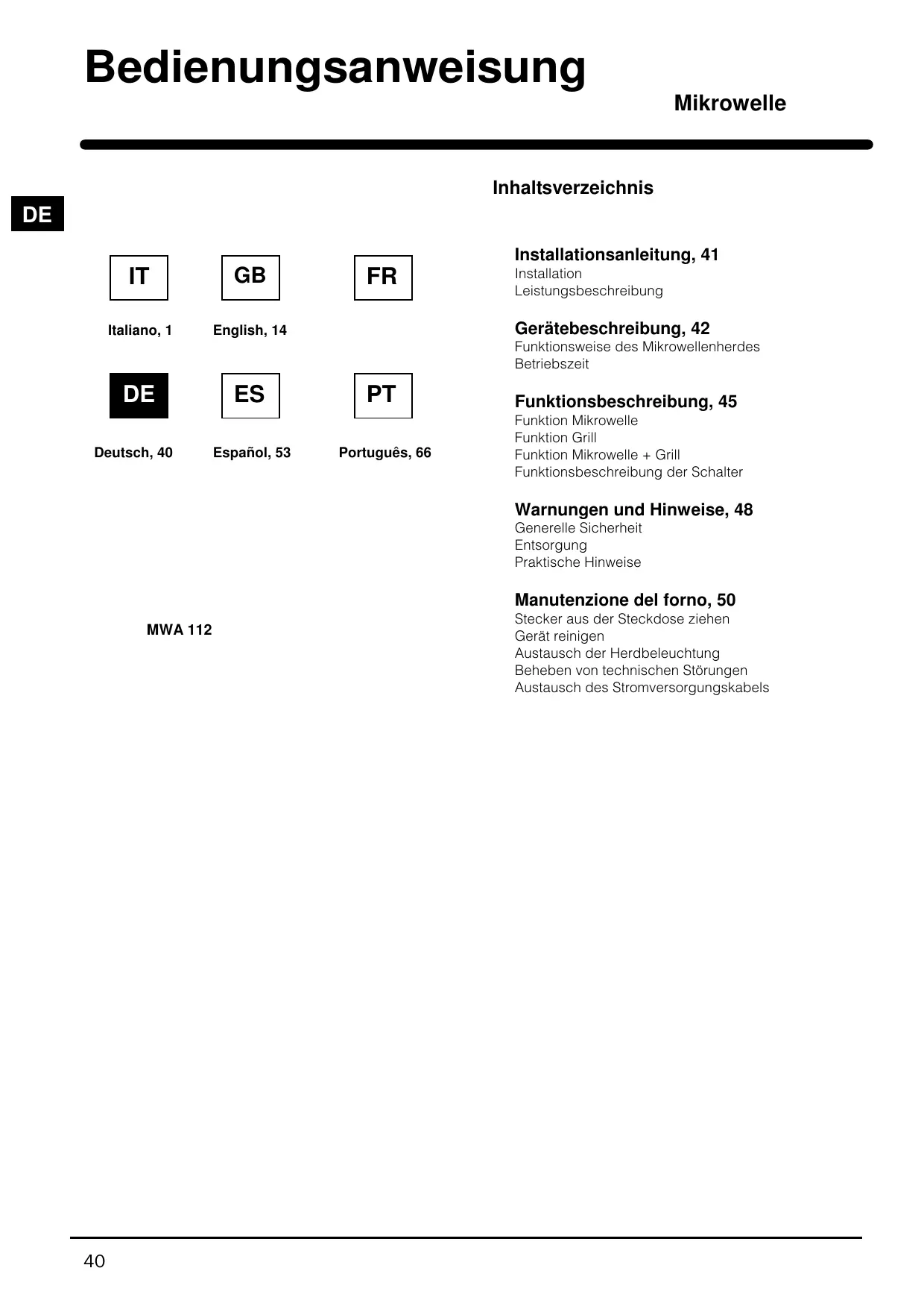 Português, 66 Funktionsbeschreibung, 45 Funktion Mikrowelle Funktion Grill Funktion Mikrowelle + Grill Funktionsbeschreibung der Schalter Warnungen und Hinweise, 48 Generelle Sicherheit Entsorgung Praktische Hinweise Manutenzione del forno, 50 MWA 112