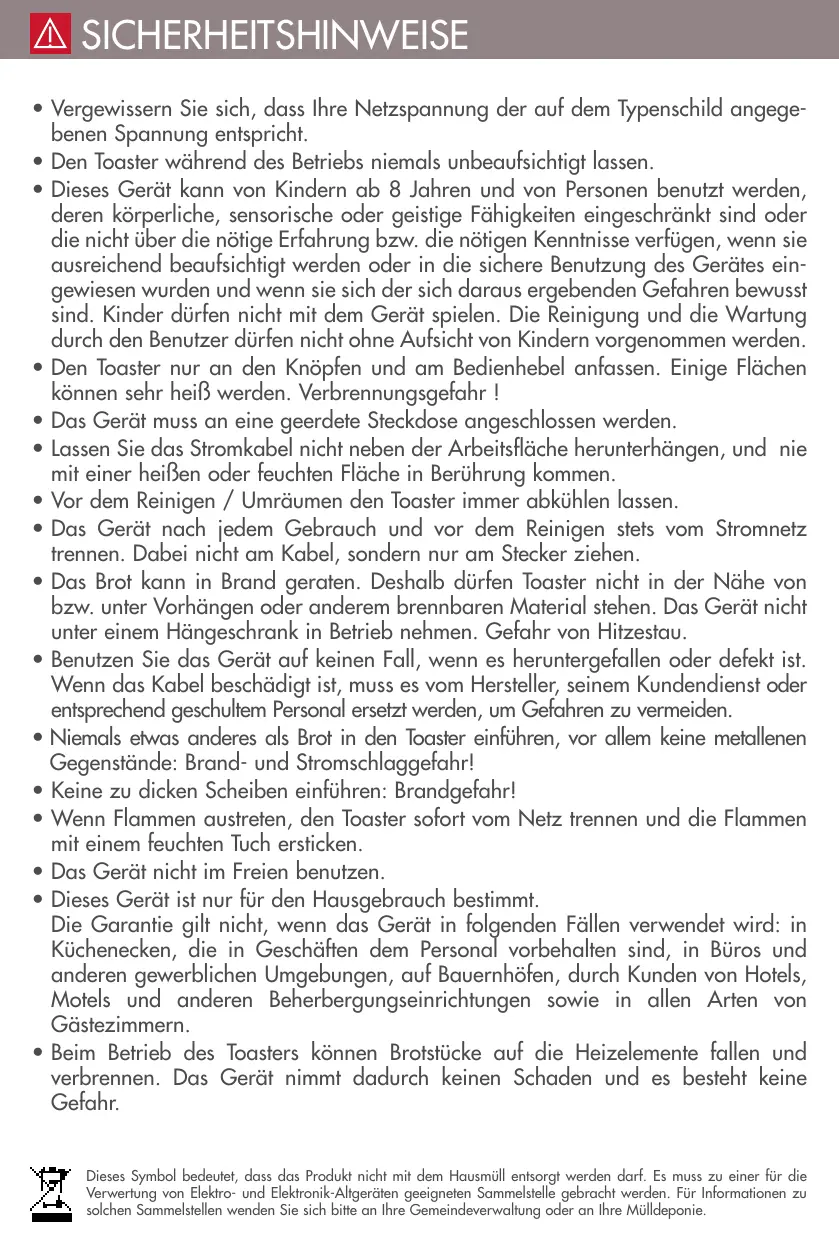 • Vergewissern Sie sich, dass Ihre Netzspannung der auf dem Typenschild angegebenen Spannung entspricht. • Den Toaster während des Betriebs niemals unbeaufsichtigt lassen. • Dieses Gerät kann von Kindern ab 8 Jahren und von Personen benutzt werden, deren körperliche, sensorische oder geistige Fähigkeiten eingeschränkt sind oder die nicht über die nötige Erfahrung bzw. die nötigen Kenntnisse verfügen, wenn sie ausreichend beaufsichtigt werden oder in die sichere Benutzung des Gerätes eingewiesen wurden und wenn sie sich der sich daraus ergebenden Gefahren bewusst sind. Kinder dürfen nicht mit dem Gerät spielen. Die Reinigung und die Wartung durch den Benutzer dürfen nicht ohne Aufsicht von Kindern vorgenommen werden. • Den Toaster nur an den Knöpfen und am Bedienhebel anfassen. Einige Flächen können sehr heiß werden. Verbrennungsgefahr ! • Das Gerät muss an eine geerdete Steckdose angeschlossen werden. • Lassen Sie das Stromkabel nicht neben der Arbeitsfläche herunterhängen, und nie mit einer heißen oder feuchten Fläche in Berührung kommen. • Vor dem Reinigen / Umräumen den Toaster immer abkühlen lassen. • Das Gerät nach jedem Gebrauch und vor dem Reinigen stets vom Stromnetz trennen. Dabei nicht am Kabel, sondern nur am Stecker ziehen. • Das Brot kann in Brand geraten. Deshalb dürfen Toaster nicht in der Nähe von bzw. unter Vorhängen oder anderem brennbaren Material stehen. Das Gerät nicht unter einem Hängeschrank in Betrieb nehmen. Gefahr von Hitzestau. • Benutzen Sie das Gerät auf keinen Fall, wenn es heruntergefallen oder defekt ist. Wenn das Kabel beschädigt ist, muss es vom Hersteller, seinem Kundendienst oder entsprechend geschultem Personal ersetzt werden, um Gefahren zu vermeiden. • Niemals etwas anderes als Brot in den Toaster einführen, vor allem keine metallenen Gegenstände: Brand- und Stromschlaggefahr! • Keine zu dicken Scheiben einführen: Brandgefahr! • Wenn Flammen austreten, den Toaster sofort vom Netz trennen und die Flammen mit einem feuchten Tuch ersticken. • Das Gerät nicht im Freien benutzen. • Dieses Gerät ist nur für den Hausgebrauch bestimmt. Die Garantie gilt nicht, wenn das Gerät in folgenden Fällen verwendet wird: in Küchenecken, die in Geschäften dem Personal vorbehalten sind, in Büros und anderen gewerblichen Umgebungen, auf Bauernhöfen, durch Kunden von Hotels, Motels und anderen Beherbergungseinrichtungen sowie in allen Arten von Gästezimmern. • Beim Betrieb des Toasters können Brotstücke auf die Heizelemente fallen und verbrennen. Das Gerät nimmt dadurch keinen Schaden und es besteht keine Gefahr. Dieses Symbol bedeutet, dass das Produkt nicht mit dem Hausmüll entsorgt werden darf. Es muss zu einer für die Verwertung von Elektro- und Elektronik-Altgeräten geeigneten Sammelstelle gebracht werden. Für Informationen zu solchen Sammelstellen wenden Sie sich bitte an Ihre Gemeindeverwaltung oder an Ihre Mülldeponie.