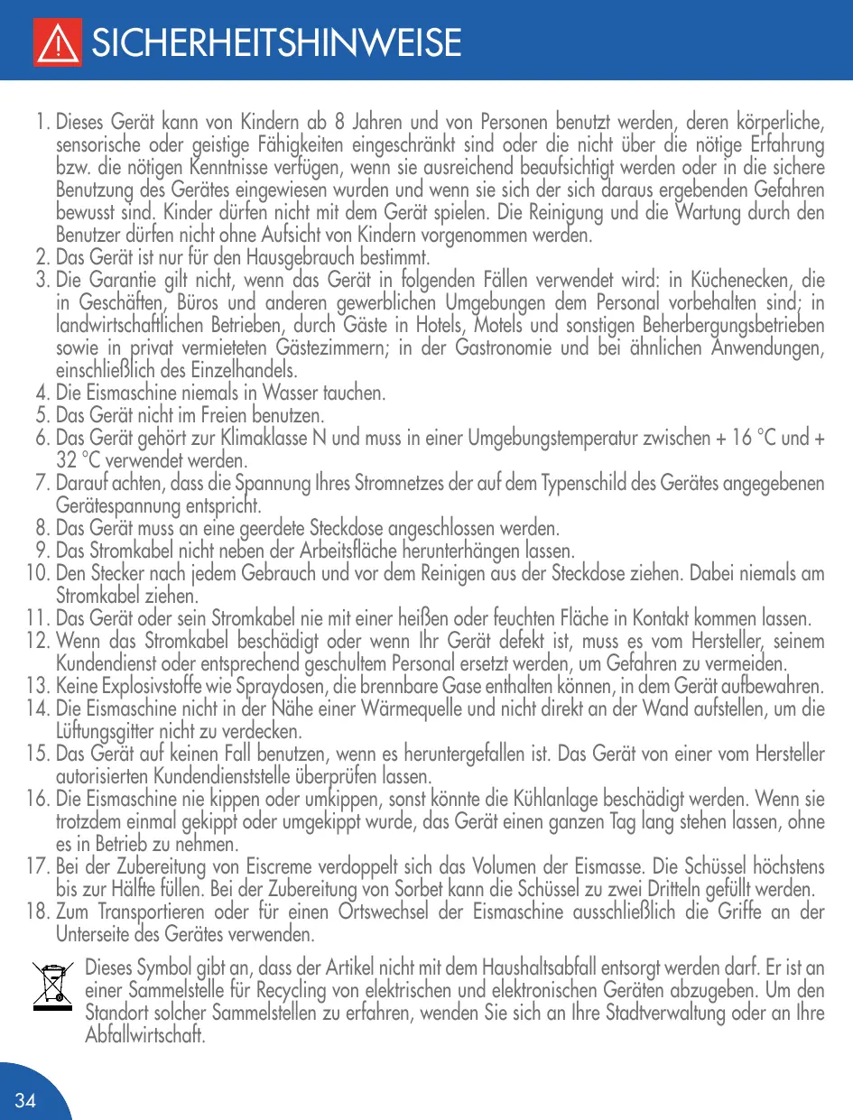 16. Die Eismaschine nie kippen oder umkippen, sonst könnte die Kühlanlage beschädigt werden. Wenn sie