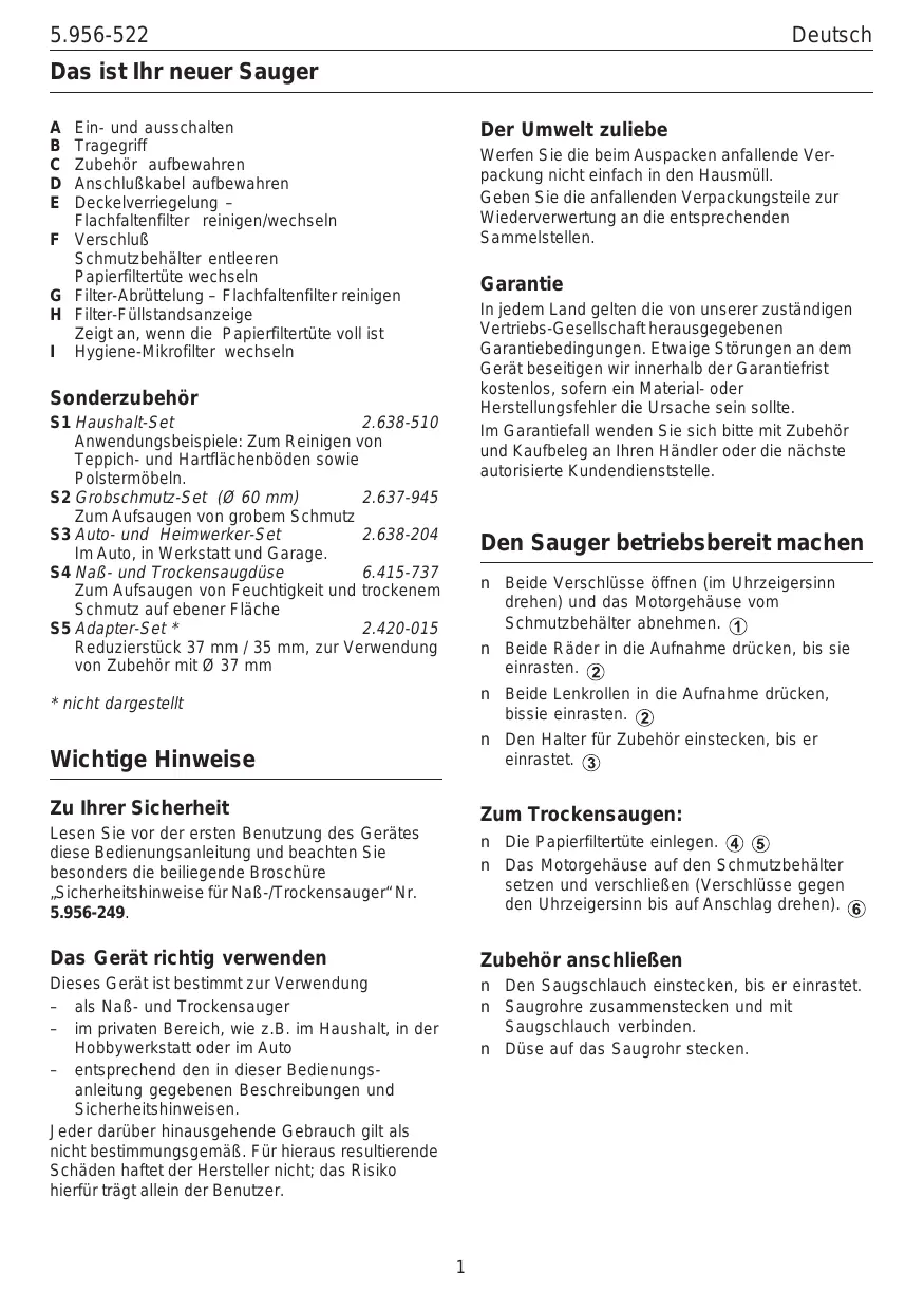 Avant la première utilisation, veuillez lire attentivement cette notice d’instructions et respecter en particuler la notice annexe intitulée «Consignes de sécurité pour aspirateurs à sec/à eau» (N° de réf.