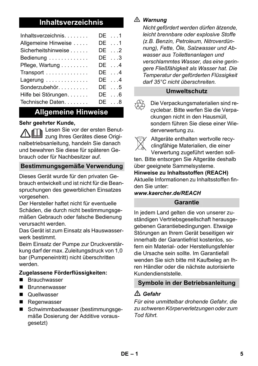 Umweltschutz Die Verpackungsmaterialien sind recyclebar. Bitte werfen Sie die Verpackungen nicht in den Hausmüll, sondern führen Sie diese einer Wiederverwertung zu. Allgemeine Hinweise Sehr geehrter Kunde, Lesen Sie vor der ersten Benutzung Ihres Gerätes diese Originalbetriebsanleitung, handeln Sie danach und bewahren Sie diese für späteren Gebrauch oder für Nachbesitzer auf. Bestimmungsgemäße Verwendung Dieses Gerät wurde für den privaten Gebrauch entwickelt und ist nicht für die Beanspruchungen des gewerblichen Einsatzes vorgesehen. Der Hersteller haftet nicht für eventuelle Schäden, die durch nicht bestimmungsgemäßen Gebrauch oder falsche Bedienung verursacht werden. Das Gerät ist zum Einsatz als Hauswasserwerk bestimmt. Beim Einsatz der Pumpe zur Druckverstärkung darf der max. Zuleitungsdruck von 1,0 bar (Pumpeneintritt) nicht überschritten werden. Zugelassene Förderflüssigkeiten: Brauchwasser Brunnenwasser Quellwasser Regenwasser Schwimmbadwasser (bestimmungsgemäße Dosierung der Additive vorausgesetzt) Altgeräte enthalten wertvolle recyclingfähige Materialien, die einer Verwertung zugeführt werden sollten. Bitte entsorgen Sie Altgeräte deshalb über geeignete Sammelsysteme. Hinweise zu Inhaltsstoffen (REACH) Aktuelle Informationen zu Inhaltsstoffen finden Sie unter: www.kaercher.de/REACH Garantie In jedem Land gelten die von unserer zuständigen Vertriebsgesellschaft herausgegebenen Garantiebedingungen. Etwaige Störungen an Ihrem Gerät beseitigen wir innerhalb der Garantiefrist kostenlos, sofern ein Material- oder Herstellungsfehler die Ursache sein sollte. Im Garantiefall wenden Sie sich bitte mit Kaufbeleg an Ihren Händler oder die nächste autorisierte Kundendienststelle. Symbole in der Betriebsanleitung Gefahr Für eine unmittelbar drohende Gefahr, die zu schweren Körperverletzungen oder zum Tod führt. DE – 1