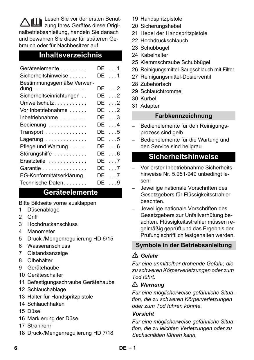 Geräteelemente Bitte Bildseite vorne ausklappen 1 Düsenablage 2 Griff 3 Hochdruckanschluss 4 Manometer 5 Druck-/Mengenregulierung HD 6/15 6 Wasseranschluss 7 Ölstandsanzeige 8 Ölbehälter 9 Gerätehaube 10 Geräteschalter 11 Befestigungsschraube Gerätehaube 12 Schlauchablage 13 Halter für Handspritzpistole 14 Schlauchhaken 15 Düse 16 Markierung der Düse 17 Strahlrohr 18 Druck-/Mengenregulierung HD 7/18