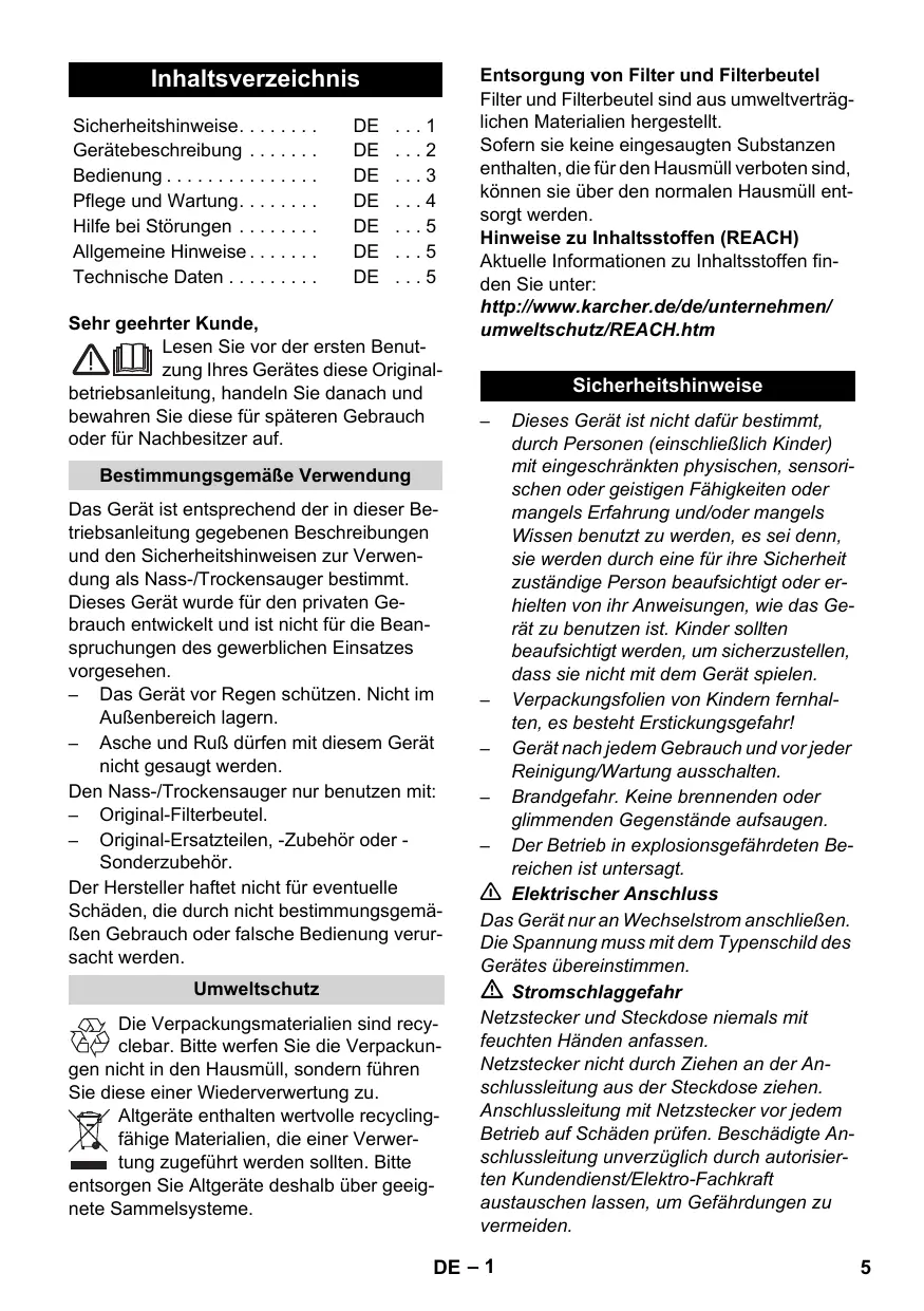 Le filtre et le sac du filtre sont fabriqués en matériaux recyclables. S'ils ne contiennent aucune substance aspirée dont l'élimination est interdite dans les déchets ménagers, vous pouvez les jeter dans les déchets ordinaires. Instructions relatives aux ingrédients (REACH) Les informations actuelles relatives aux ingrédients se trouvent sous : http://www.karcher.de/de/unternehmen/ umweltschutz/REACH.htm
