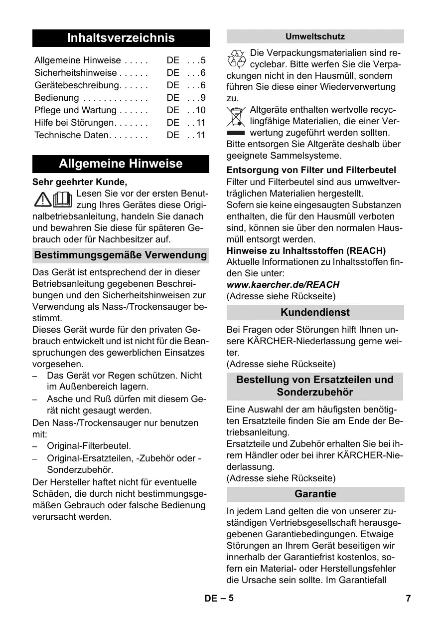 Elimination du filtre et du sac du filtre Le filtre et le sac du filtre sont fabriqués en matériaux recyclables. S'ils ne contiennent aucune substance aspirée dont l'élimination est interdite dans les déchets ménagers, vous pouvez les jeter dans les déchets ordinaires. Instructions relatives aux ingrédients (REACH) Les informations actuelles relatives aux ingrédients se trouvent sous : www.kaercher.com/REACH (Adresse au dos)