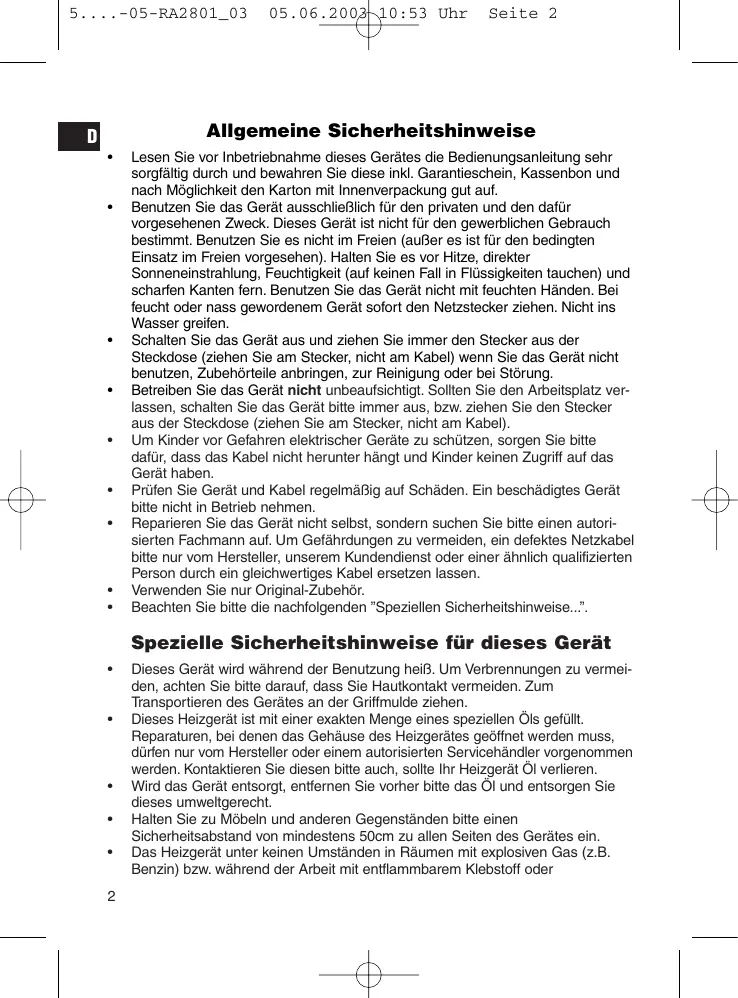 Dieses Gerät wird während der Benutzung heiß. Um Verbrennungen zu vermeiden, achten Sie bitte darauf, dass Sie Hautkontakt vermeiden. Zum Transportieren des Gerätes an der Griffmulde ziehen. Dieses Heizgerät ist mit einer exakten Menge eines speziellen Öls gefüllt. Reparaturen, bei denen das Gehäuse des Heizgerätes geöffnet werden muss, dürfen nur vom Hersteller oder einem autorisierten Servicehändler vorgenommen werden. Kontaktieren Sie diesen bitte auch, sollte Ihr Heizgerät Öl verlieren. Wird das Gerät entsorgt, entfernen Sie vorher bitte das Öl und entsorgen Sie dieses umweltgerecht. Halten Sie zu Möbeln und anderen Gegenständen bitte einen Sicherheitsabstand von mindestens 50cm zu allen Seiten des Gerätes ein. Das Heizgerät unter keinen Umständen in Räumen mit explosiven Gas (z.B. Benzin) bzw. während der Arbeit mit entflammbarem Klebstoff oder