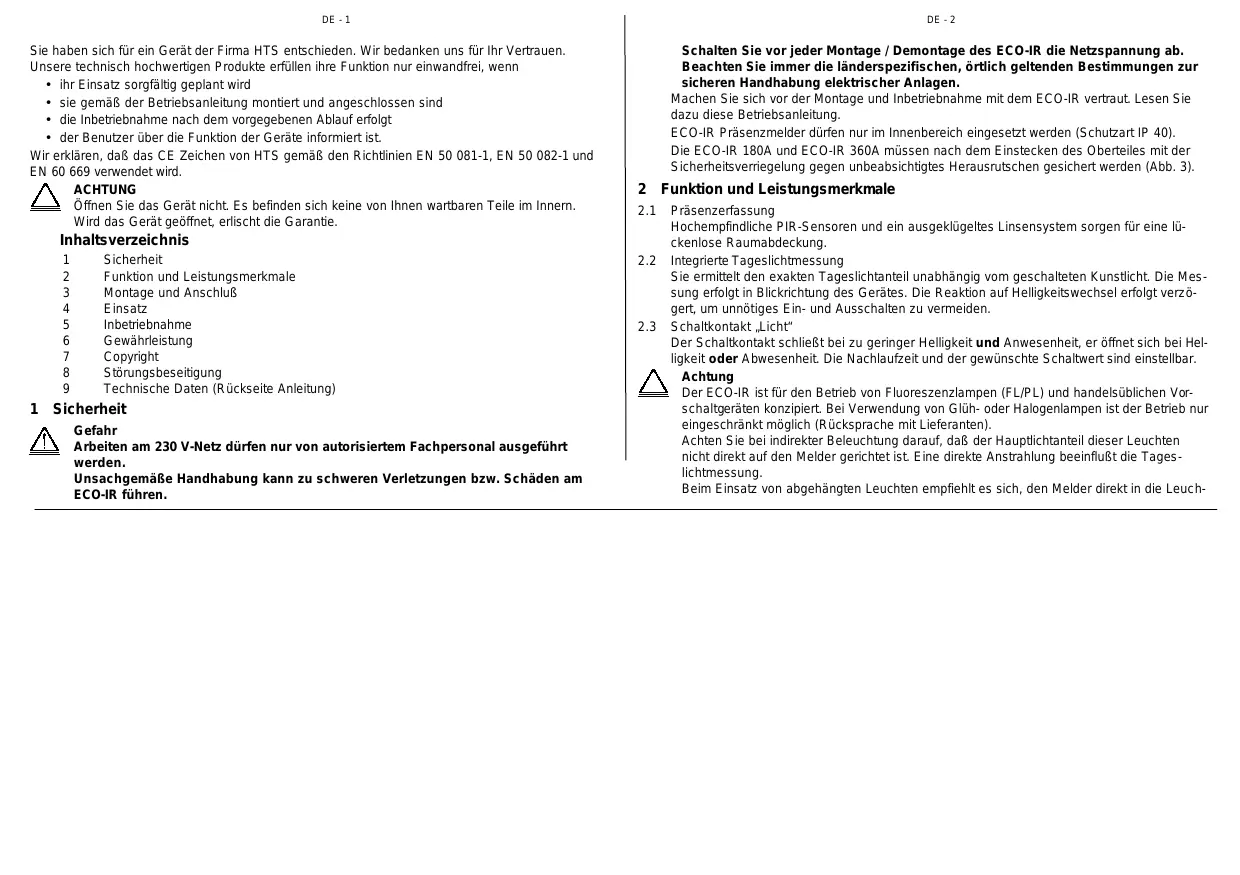 - der Benutzer über die Funktion der Geräte informiert ist. Wir erklären, daß das CE Zeichen von HTS gemäß den Richtlinien EN 50 081-1, EN 50 082-1 und EN 60 669 verwendet wird. ACHTUNG Öffnen Sie das Gerät nicht. Es befinden sich keine von Ihnen wartbaren Teile im Innern. Wird das Gerät geöffnet, erlischt die Garantie. DE - 2 Schalten Sie vor jeder Montage / Demontage des ECO-IR die Netzspannung ab. Beachten Sie immer die länderspezifischen, örtlich geltenden Bestimmungen zur sicheren Handhabung elektrischer Anlagen. Machen Sie sich vor der Montage und Inbetriebnahme mit dem ECO-IR vertraut. Lesen Sie dazu diese Betriebsanleitung. ECO-IR Präsenzmelder dürfen nur im Innenbereich eingesetzt werden (Schutzart IP 40). Die ECO-IR 180A und ECO-IR 360A müssen nach dem Einstecken des Oberteiles mit der Sicherheitsverriegelung gegen unbeabsichtigtes Herausrutschen gesichert werden (Abb. 3). 2 Funktion und Leistungsmerkmale