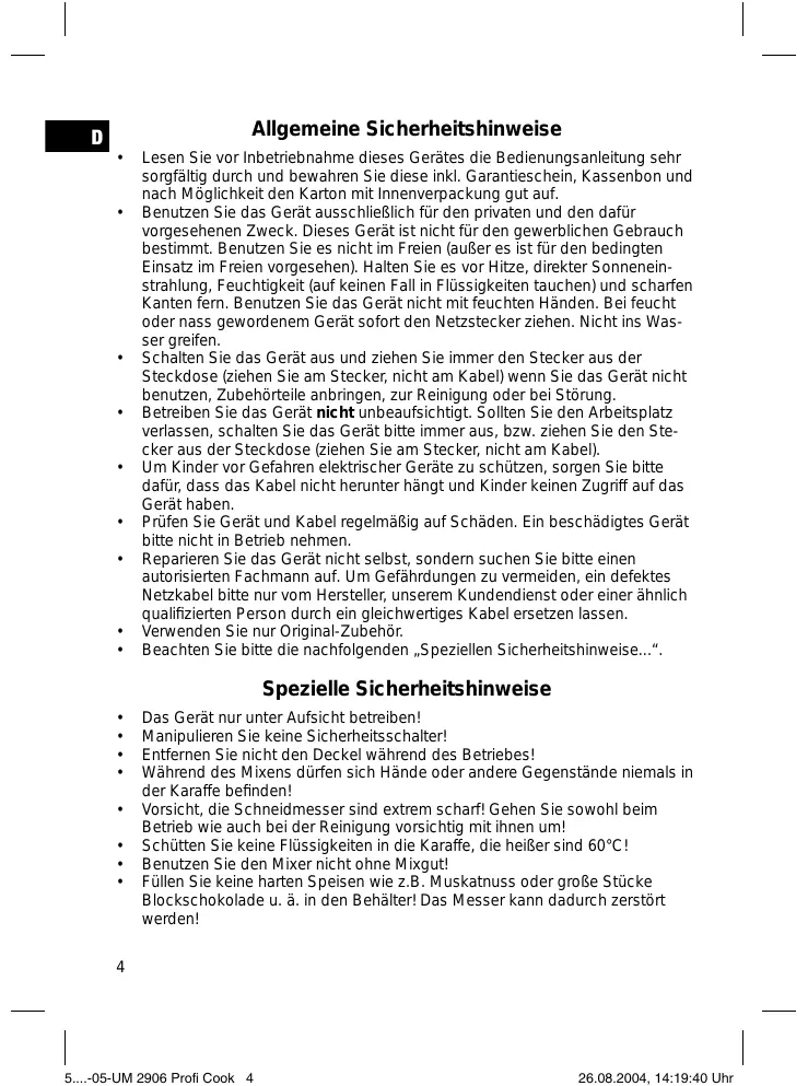 Das Gerät nur unter Aufsicht betreiben! Manipulieren Sie keine Sicherheitsschalter! Entfernen Sie nicht den Deckel während des Betriebes! Während des Mixens dürfen sich Hände oder andere Gegenstände niemals in der Karaffe befinden! Vorsicht, die Schneidmesser sind extrem scharf! Gehen Sie sowohl beim Betrieb wie auch bei der Reinigung vorsichtig mit ihnen um! Schütten Sie keine Flüssigkeiten in die Karaffe, die heißer sind 60°C! Benutzen Sie den Mixer nicht ohne Mixgut! Füllen Sie keine harten Speisen wie z.B. Muskatnuss oder große Stücke Blockschokolade u. ä. in den Behälter! Das Messer kann dadurch zerstört werden!