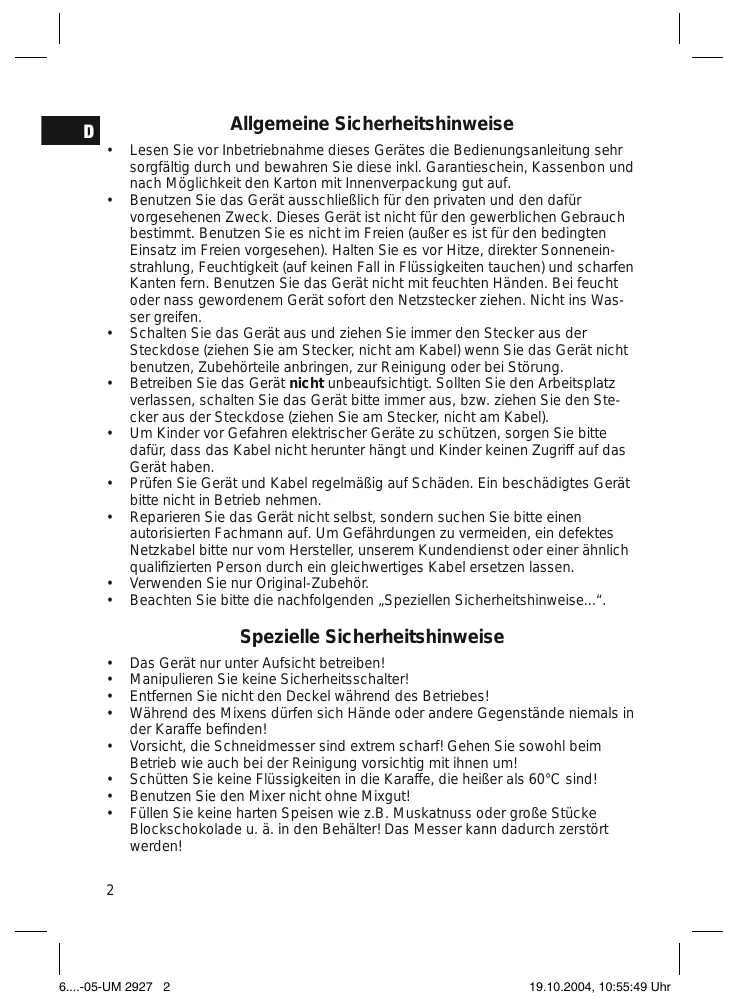 Das Gerät nur unter Aufsicht betreiben! Manipulieren Sie keine Sicherheitsschalter! Entfernen Sie nicht den Deckel während des Betriebes! Während des Mixens dürfen sich Hände oder andere Gegenstände niemals in der Karaffe befinden! Vorsicht, die Schneidmesser sind extrem scharf! Gehen Sie sowohl beim Betrieb wie auch bei der Reinigung vorsichtig mit ihnen um! Schütten Sie keine Flüssigkeiten in die Karaffe, die heißer als 60°C sind! Benutzen Sie den Mixer nicht ohne Mixgut! Füllen Sie keine harten Speisen wie z.B. Muskatnuss oder große Stücke Blockschokolade u. ä. in den Behälter! Das Messer kann dadurch zerstört werden!