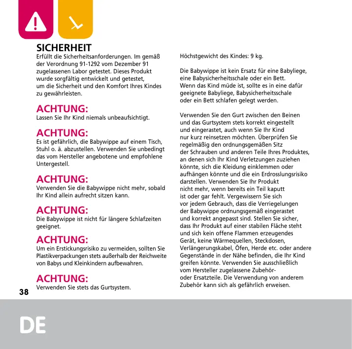 SICHERHEIT Erfüllt die Sicherheitsanforderungen. Im gemäß der Verordnung 91-1292 vom Dezember 91 zugelassenen Labor getestet. Dieses Produkt wurde sorgfältig entwickelt und getestet, um die Sicherheit und den Komfort Ihres Kindes zu gewährleisten. ACHTUNG: Lassen Sie Ihr Kind niemals unbeaufsichtigt. ACHTUNG: Es ist gefährlich, die Babywippe auf einem Tisch, Stuhl o. ä. abzustellen. Verwenden Sie unbedingt das vom Hersteller angebotene und empfohlene Untergestell. ACHTUNG: Verwenden Sie die Babywippe nicht mehr, sobald Ihr Kind allein aufrecht sitzen kann. ACHTUNG: Die Babywippe ist nicht für längere Schlafzeiten geeignet. ACHTUNG: Um ein Erstickungsrisiko zu vermeiden, sollten Sie Plastikverpackungen stets außerhalb der Reichweite von Babys und Kleinkindern aufbewahren. ACHTUNG: