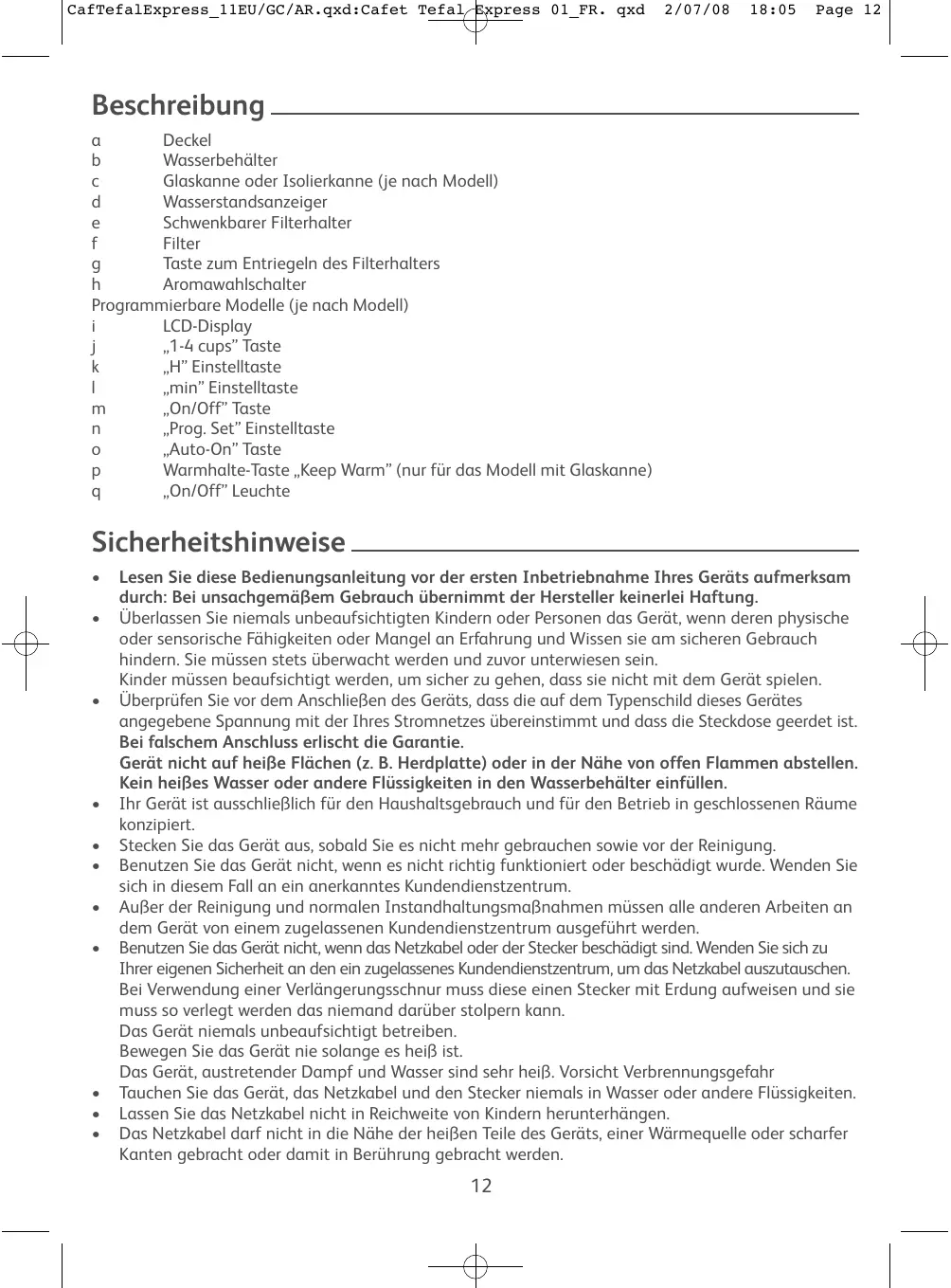 Lire attentivement le mode d’emploi avant la première utilisation de votre appareil : une utilisation non conforme dégagerait le fabricant de toute responsabilité. • Cet appareil n’est pas prévu pour être utilisé par des personnes (y compris les enfants) dont les capacités physiques, sensorielles ou mentales sont réduites ou des personnes dénuées d’expérience ou de connaissance, sauf si elles ont pu bénéficier, par l’intermédiaire d’une personne responsable de leur sécurité, d’une surveillance ou d’instructions préalables concernant l’utilisation de l’appareil. Il convient de surveiller les enfants pour s’assurer qu’ils ne jouent pas avec l’appareil. • Avant de brancher l’appareil, vérifier que la tension d’alimentation de votre installation correspond à celle de l’appareil et que la prise de courant comporte bien la terre. Toute erreur de branchement annule la garantie. • Votre appareil est destiné uniquement à un usage domestique et à l’intérieur de la maison. • Débrancher l’appareil dès que vous cessez de l’utiliser et que vous le nettoyez. • Ne pas utiliser l’appareil s’il ne fonctionne pas correctement ou s’il a été endommagé. Dans ce cas, s’adresser à un centre service agréé. • Toute intervention autre que le nettoyage et l’entretien usuel par le client doit être effectuée par un centre service agréé. • Si le câble d’alimentation ou la fiche sont endommagés, n’utilisez pas l’appareil. Afin d’éviter tout danger, faites obligatoirement remplacer le câble d’alimentation par un centre agréé. • Ne pas mettre l’appareil, le câble d’alimentation ou la fiche dans l’eau ou tout autre liquide. • Ne pas laisser pendre le câble d’alimentation à portée de main des enfants. • Le câble d’alimentation ne doit jamais être à proximité ou en contact avec les parties chaudes de votre appareil, près d’une source de chaleur ou sur un angle vif. • Pour votre sécurité, n’utiliser que des accessoires et des pièces détachées du fabricant adaptés à votre appareil. • Ne pas débrancher la fiche de la prise en tirant sur le câble. • Ne pas utiliser la verseuse ou le pot isotherme sur une flamme et sur des plaques de cuisinières électriques. • Ne pas remettre d’eau dans l’appareil s’il est encore chaud. • Toujours fermer le couvercle (a) lors du fonctionnement de la cafetière. •