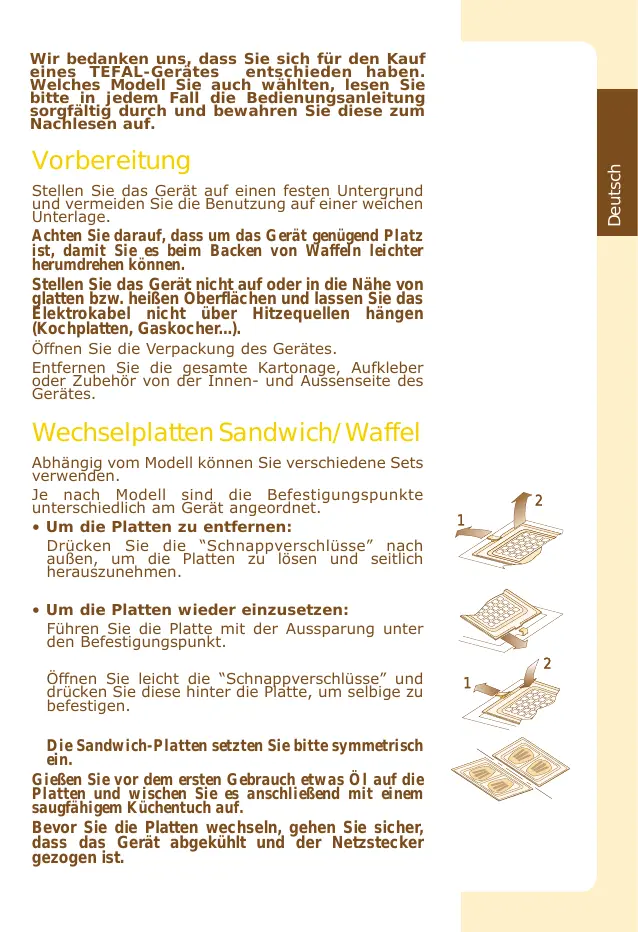 - 250 g Mehl • 10 g Backpulver • 1 Prise Salz • 2 Stückchen Zucker • 75 g Butter • 2 Eier • 1/4 l Milch • 1 Glas Cognac • Vanille-Eis • Schokolade Verrühren Sie Backpulver, Zucker und ein Glas Wasser, lassen es 15 Minuten stehen. Rühren Sie dies anschließend unter die Eier und die Butter. Geben Sie dann Milch, Mehl, Cognac und Salz hinzu, bis Sie eine flüssige Mixtur haben. Lassen Sie diesen Teig ca. 3 Stunden in einem warmen Raum stehen. Vor dem Servieren geben Sie 2 Kugeln Vanilleeis mit etwas heißer Schokolade hinzu (Man kann auch Puderzucker oder Marmelade dazu servieren). Rezepte Setzen Sie die Grillplatten ein. Stellen Sie den Thermostat (je nach Modell) auf Maximal. Legen Sie das Fleisch auf die Heizplatten. Schließen Sie das Gerät und lassen Sie es, je nach Rezept und Ihrem Geschmack, braten. Bearnaise tournedos Kochzeit: 3-4 Minuten Pro Person: • 1 x 120 g Tournedos (ein möglichst gut abgehangenes Rinderfilet) • Öl • Salz • Pfeffer Wenden Sie das Fleisch in Öl und würzen Sie es von beiden Seiten. Grillen Sie es für ca. 3 Minuten (wenn Sie es englisch haben möchten) oder 4 Minuten (wenn Sie es gut durch haben möchten). Servieren Sie es mit einer Bearnaise-Soße. Steak mit Thymian Kochzeit: 3 Minuten Pro Person: • 1 x 150 g Rumpsteak (ca. 2 cm dick) • 1/2 Teelöffel Öl • 1 Stengel frischer Thymian Wenden Sie das Steak in Öl. Entfernen Sie die Blätter des Thymians und bestreuen Sie damit beide Seiten des Steaks. Grillen Sie die Steaks 2 bis 3 Minuten, je nach dem ob Sie es roh oder durch haben möchten. Servieren Sie das Ganze mit der Beilage Ihrer Wahl. Mirabeau Steak Kochzeit: 3 Minuten Pro Person: • ungefähr 350 g Steak (3 cm dick) • 2 gesalzene Anchovis • 25 g Butter • 25 g grüne Oliven Waschen Sie die Anchovis unter fließendem Wasser und entfernen Sie die Gräten. Grillen Sie die Steaks dann 2 bis 3 Minuten, je nach dem ob Sie es roh oder durch haben möchten. Direkt vor dem Servieren geben Sie die Anchovis-Fillets und ein Stückchen Butter auf das Steak und garnieren das Ganze mit grünen Oliven. Geben Sie nach Bedarf Pfeffer hinzu. Kalbs-Outlet “surprise” Kochzeit: 6 Minuten Pro Person: • 1 Kalbskotelett • 1/2 Scheibe Schinken (wenn möglich roh) • Schweizer Käse • Salz • Pfeffer Schneiden Sie das Kalbskotelett längs auf. Geben Sie die halben Scheiben Schinken und den Käse hinein. Bestreuen Sie das Ganze mit Salz und Pfeffer und servieren es mit Tomatensoße. Deutsch Grillen Thank you for purchasing this Tefal appliance. Whatever your model, please read the instructions carefully and keep them to hand. The safety of this appliance complies with the technical regulations and standards in force at the time. Installation Place the appliance on a firm table : do not use it on a soft base. Keep enough space around the appliance to be able to turn it over easily when cooking waffles. Do not place the appliance on or near slippery or hot surfaces, never leave the cord hanging over a heat source (cooking plates, gas cooker...). Open the appliance. Remove any packaging, stickers or accessories inside and outside the appliance. Choice of the plates Depending on model, you can use different sets of plates that you can buy separately. Depending on model, the fixing “pins” are placed differently on the appliance.