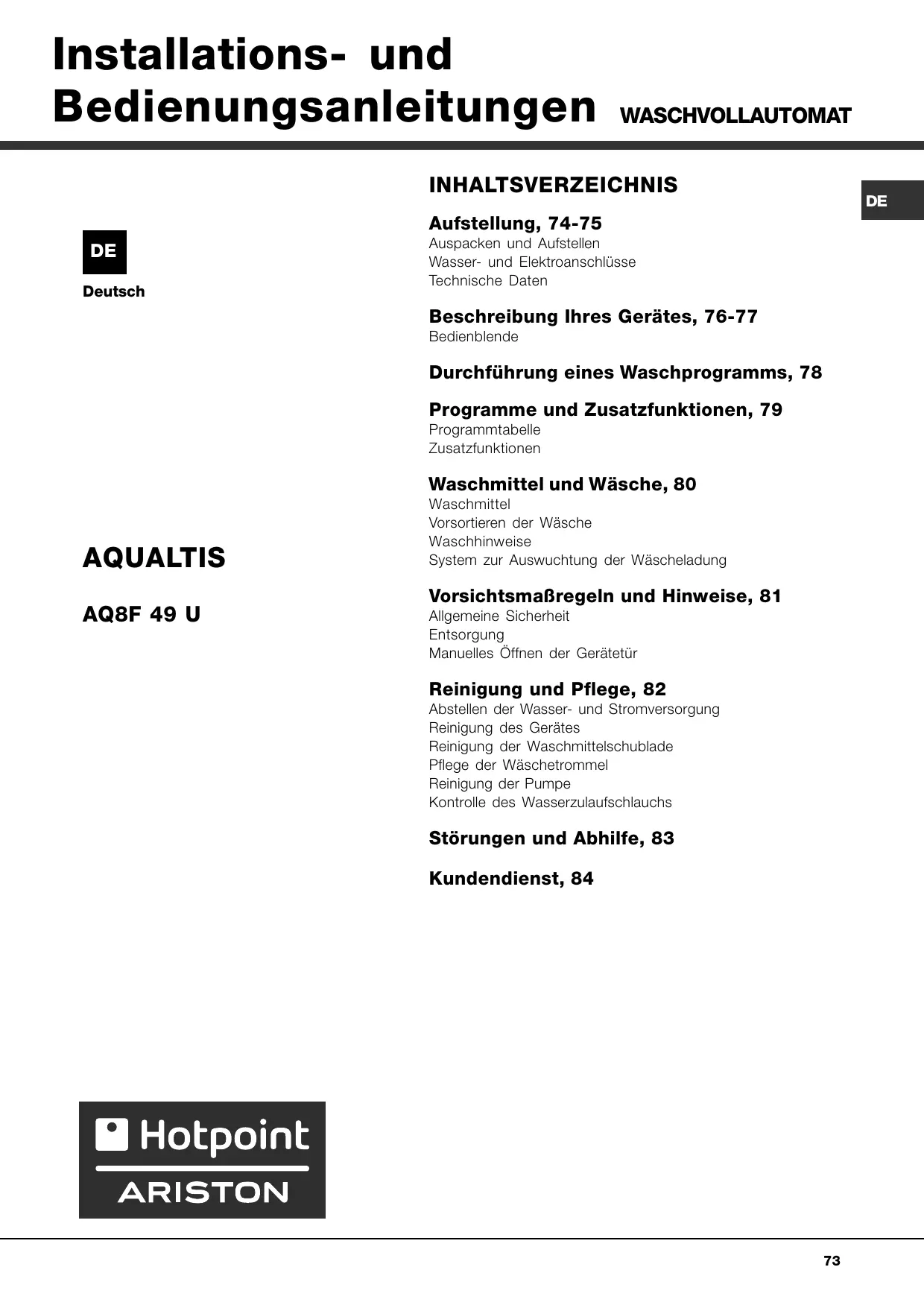 Laden Sie die Anleitung für Ihr Waschmaschine kostenlos im PDF-Format! Finden Sie Ihr Handbuch AQ8F 49 U - HOTPOINT und nehmen Sie Ihr elektronisches Gerät wieder in die Hand. Auf dieser Seite sind alle Dokumente veröffentlicht, die für die Verwendung Ihres Geräts notwendig sind. AQ8F 49 U von der Marke HOTPOINT.