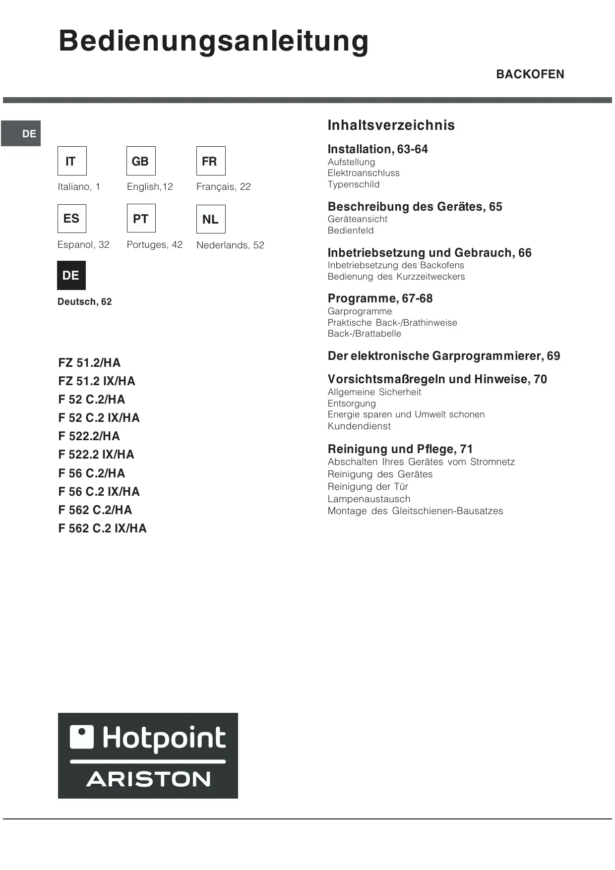 Finden Sie kostenlos die Bedienungsanleitung des Geräts FZ 51.2 IX/HA HOTPOINT als PDF.