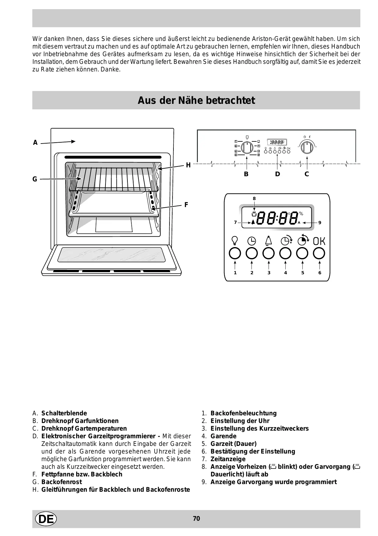 Wir danken Ihnen, dass Sie dieses sichere und äußerst leicht zu bedienende Ariston-Gerät gewählt haben. Um sich mit diesem vertraut zu machen und es auf optimale Art zu gebrauchen lernen, empfehlen wir Ihnen, dieses Handbuch vor Inbetriebnahme des Gerätes aufmerksam zu lesen, da es wichtige Hinweise hinsichtlich der Sicherheit bei der Installation, dem Gebrauch und der Wartung liefert. Bewahren Sie dieses Handbuch sorgfältig auf, damit Sie es jederzeit zu Rate ziehen können. Danke. Aus der Nähe betrachtet