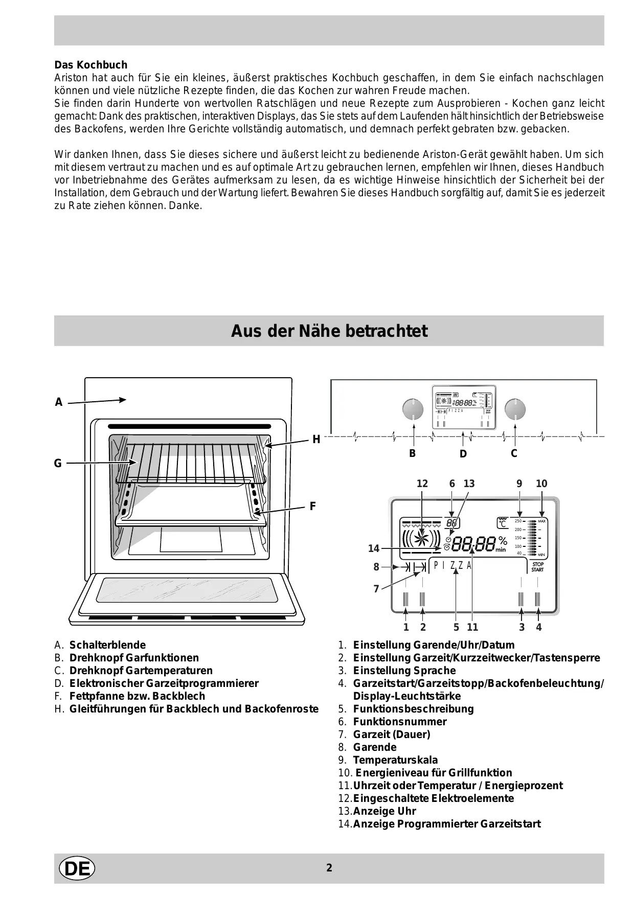 Das Kochbuch Ariston hat auch für Sie ein kleines, äußerst praktisches Kochbuch geschaffen, in dem Sie einfach nachschlagen können und viele nützliche Rezepte finden, die das Kochen zur wahren Freude machen. Sie finden darin Hunderte von wertvollen Ratschlägen und neue Rezepte zum Ausprobieren - Kochen ganz leicht gemacht: Dank des praktischen, interaktiven Displays, das Sie stets auf dem Laufenden hält hinsichtlich der Betriebsweise des Backofens, werden Ihre Gerichte vollständig automatisch, und demnach perfekt gebraten bzw. gebacken. Wir danken Ihnen, dass Sie dieses sichere und äußerst leicht zu bedienende Ariston-Gerät gewählt haben. Um sich mit diesem vertraut zu machen und es auf optimale Art zu gebrauchen lernen, empfehlen wir Ihnen, dieses Handbuch vor Inbetriebnahme des Gerätes aufmerksam zu lesen, da es wichtige Hinweise hinsichtlich der Sicherheit bei der Installation, dem Gebrauch und der Wartung liefert. Bewahren Sie dieses Handbuch sorgfältig auf, damit Sie es jederzeit zu Rate ziehen können. Danke.