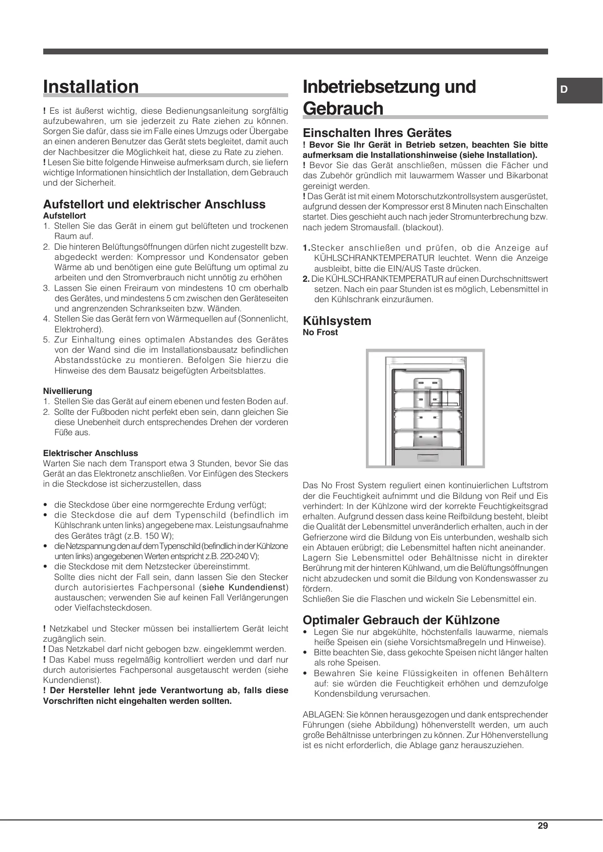 - die Steckdose mit dem Netzstecker übereinstimmt. Sollte dies nicht der Fall sein, dann lassen Sie den Stecker durch autorisiertes Fachpersonal (siehe Kundendienst) austauschen; verwenden Sie auf keinen Fall Verlängerungen oder Vielfachsteckdosen. ! Netzkabel und Stecker müssen bei installiertem Gerät leicht zugänglich sein. ! Das Netzkabel darf nicht gebogen bzw. eingeklemmt werden. ! Das Kabel muss regelmäßig kontrolliert werden und darf nur durch autorisiertes Fachpersonal ausgetauscht werden (siehe Kundendienst). ! Der Hersteller lehnt jede Verantwortung ab, falls diese Vorschriften nicht eingehalten werden sollten. Das No Frost System reguliert einen kontinuierlichen Luftstrom der die Feuchtigkeit aufnimmt und die Bildung von Reif und Eis verhindert: In der Kühlzone wird der korrekte Feuchtigkeitsgrad erhalten. Aufgrund dessen dass keine Reifbildung besteht, bleibt die Qualität der Lebensmittel unveränderlich erhalten, auch in der Gefrierzone wird die Bildung von Eis unterbunden, weshalb sich ein Abtauen erübrigt; die Lebensmittel haften nicht aneinander. Lagern Sie Lebensmittel oder Behältnisse nicht in direkter Berührung mit der hinteren Kühlwand, um die Belüftungsöffnungen nicht abzudecken und somit die Bildung von Kondenswasser zu fördern. Schließen Sie die Flaschen und wickeln Sie Lebensmittel ein. Optimaler Gebrauch der Kühlzone