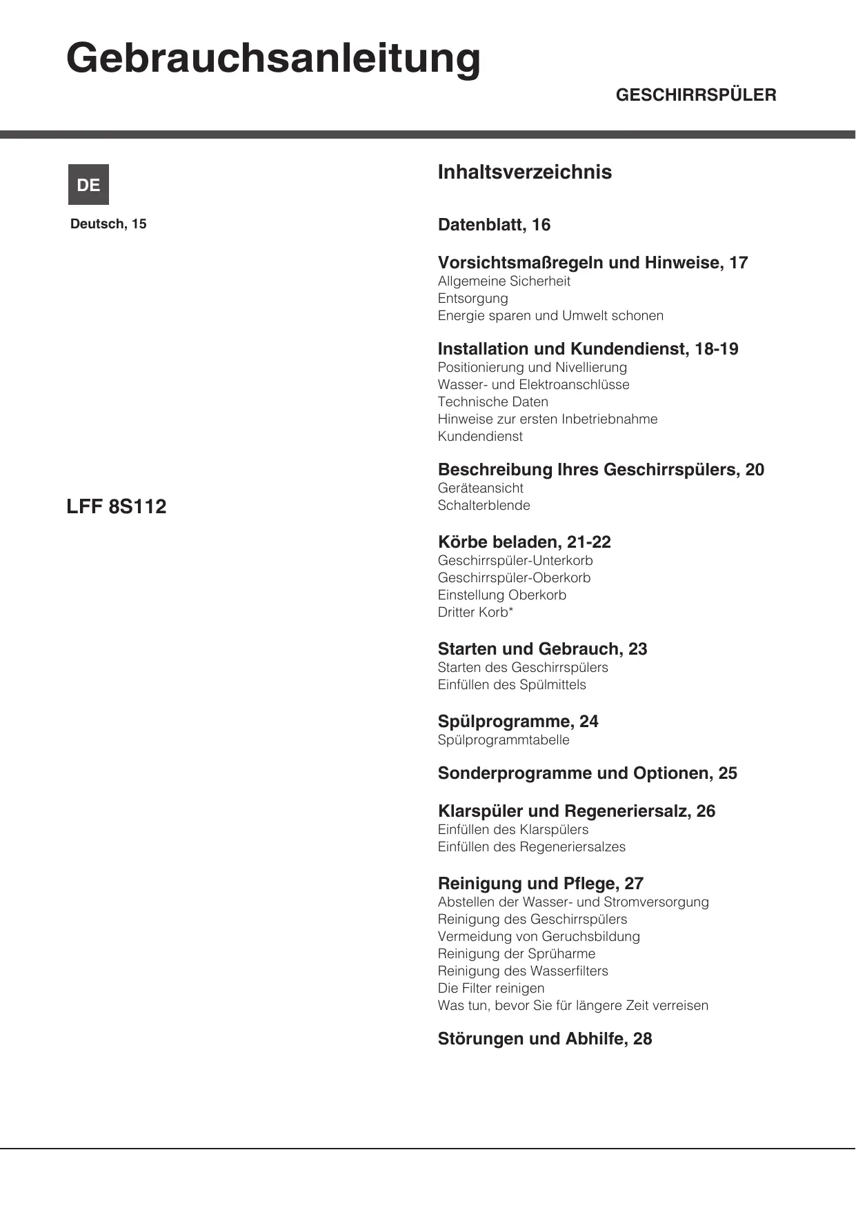 Gebrauchsanleitung GESCHIRRSPÜLER De | Inhaltsverzeichnis Deutsch, 15 Datenblatt, 16 VorsichtsmaBregeln und Hinweise, 17 Allgemeine Sicherheit Entsorgung Energie sparen und Umwelt schonen Installation und Kundendienst, 18-19 Positionierung und Nivellierung Wasser- und Elektroanschlüsse Technische Daten Hinweise zur ersten Inbetriebnahme Kundendienst Beschreibung lhres Geschirrspülers, 20 Geräteansicht LFF 8S112 Schalterblende Kôürbe beladen, 21-22 Geschirrspüler-Unterkorb Geschirrspüler-Oberkorb Einstellung Oberkorb Dritter Korb* Starten und Gebrauch, 23 Starten des Geschirrspülers Einfüllen des Spülmittels Spülprogramme, 24 Spülprogrammtabelle Sonderprogramme und Optionen, 25 Klarspüler und Regeneriersalz, 26 Einfüllen des Klarspülers Einfüllen des Regeneriersalzes Reinigung und Pflege, 27 Abstellen der Wasser- und Stromversorgung Reinigung des Geschirrspülers Vermeidung von Geruchsbildung Reinigung der Sprüharme Reinigung des Wasserfilters Die Filter reinigen Was tun, bevor Sie für längere Zeit verreisen Stôrungen und Abhilfe, 28