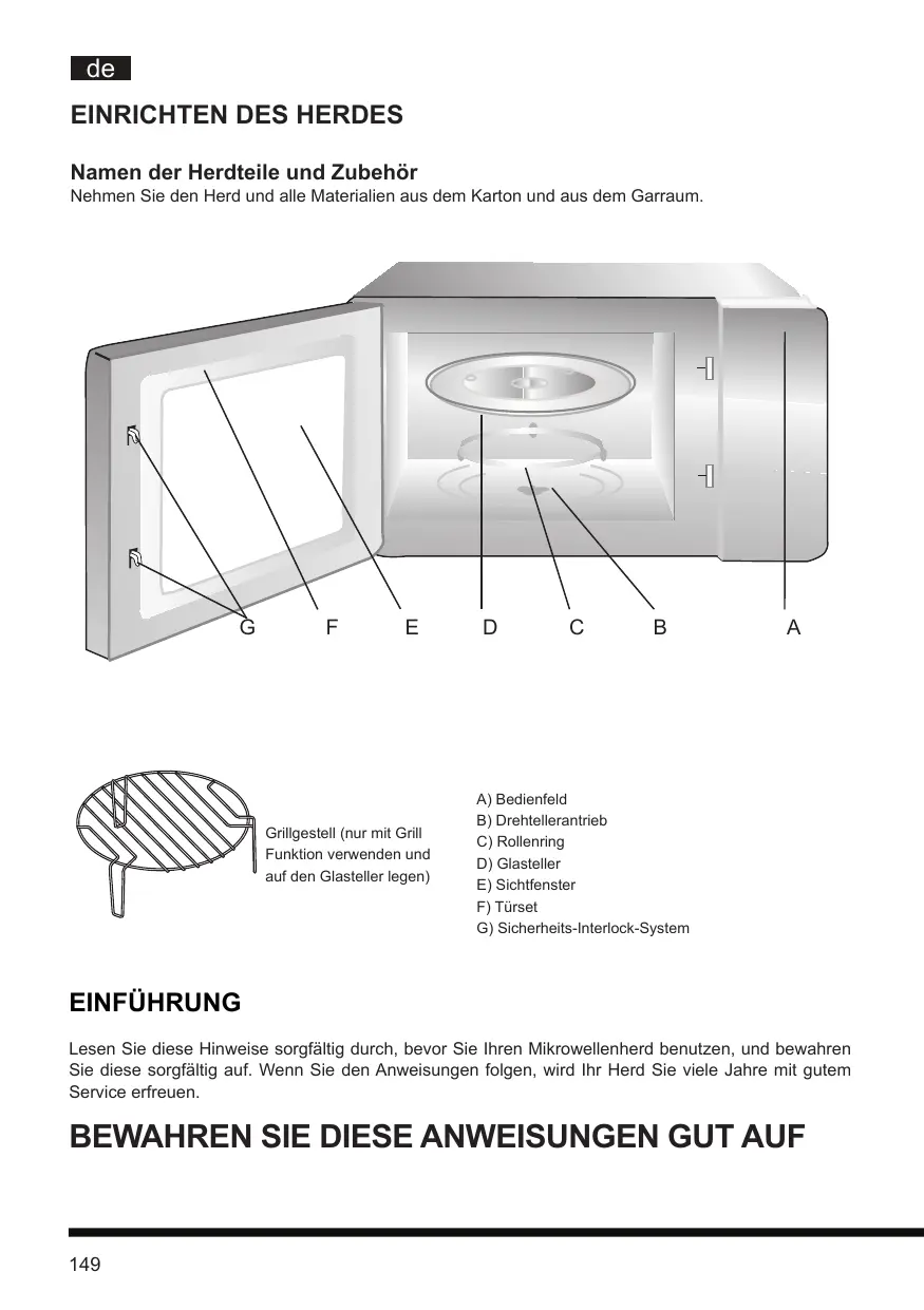A) Bedienfeld B) Drehtellerantrieb C) Rollenring D) Glasteller E) Sichtfenster F) Türset G) Sicherheits-Interlock-System