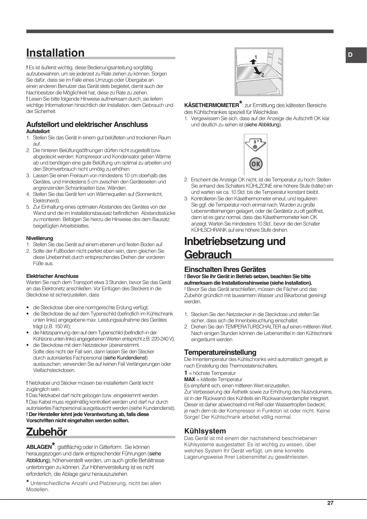 ! Bevor Sie Ihr Gerät in Betrieb setzen, beachten Sie bitte aufmerksam die Installationshinweise (siehe Installation). ! Bevor Sie das Gerät anschließen, müssen die Fächer und das Zubehör gründlich mit lauwarmem Wasser und Bikarbonat gereinigt werden.