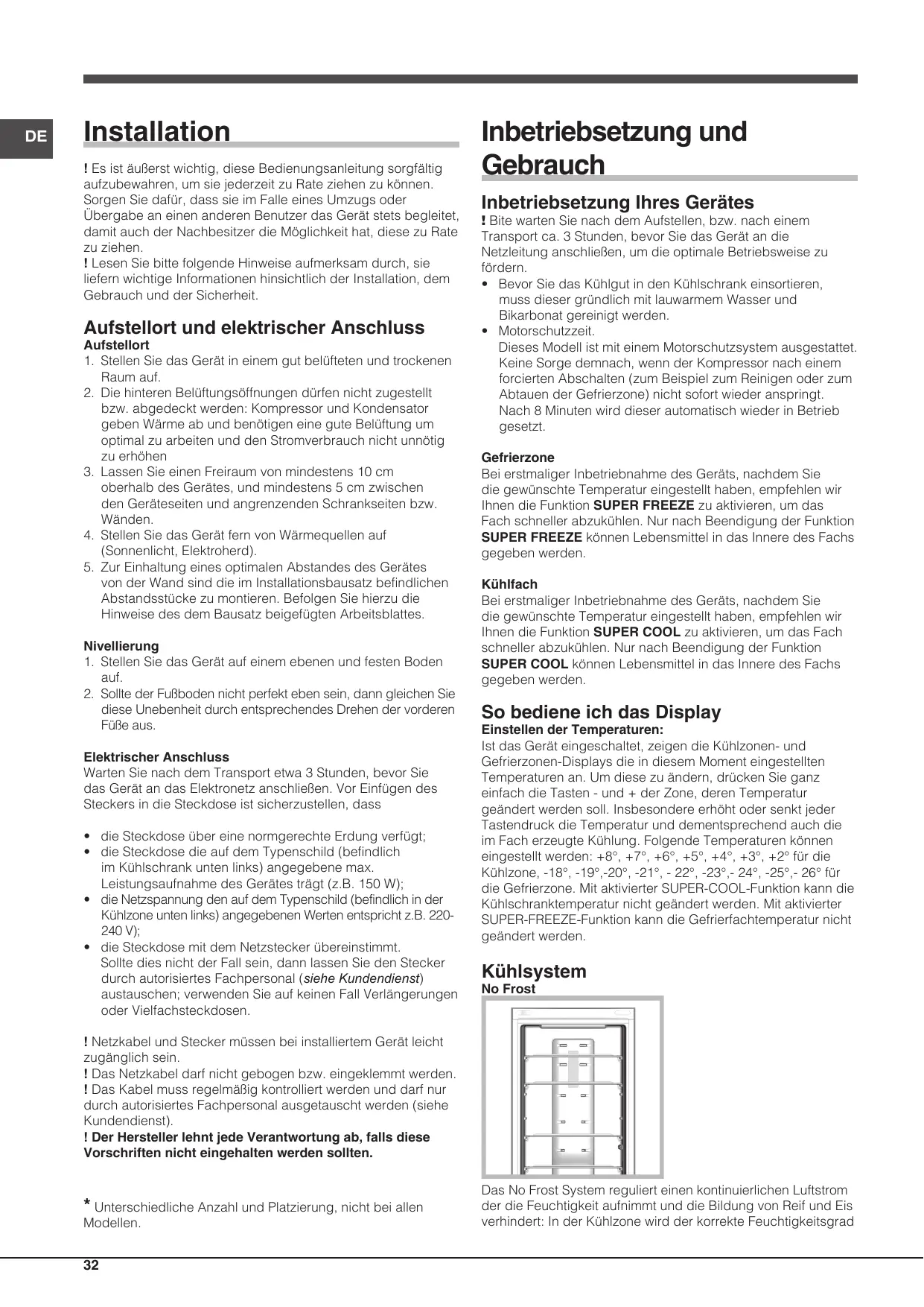 - Motorschutzzeit. Dieses Modell ist mit einem Motorschutzsystem ausgestattet. Keine Sorge demnach, wenn der Kompressor nach einem forcierten Abschalten (zum Beispiel zum Reinigen oder zum Abtauen der Gefrierzone) nicht sofort wieder anspringt. Nach 8 Minuten wird dieser automatisch wieder in Betrieb gesetzt. Gefrierzone Bei erstmaliger Inbetriebnahme des Geräts, nachdem Sie die gewünschte Temperatur eingestellt haben, empfehlen wir Ihnen die Funktion SUPER FREEZE zu aktivieren, um das Fach schneller abzukühlen. Nur nach Beendigung der Funktion SUPER FREEZE können Lebensmittel in das Innere des Fachs gegeben werden. Kühlfach Bei erstmaliger Inbetriebnahme des Geräts, nachdem Sie die gewünschte Temperatur eingestellt haben, empfehlen wir Ihnen die Funktion SUPER COOL zu aktivieren, um das Fach schneller abzukühlen. Nur nach Beendigung der Funktion SUPER COOL können Lebensmittel in das Innere des Fachs gegeben werden. So bediene ich das Display Einstellen der Temperaturen: Ist das Gerät eingeschaltet, zeigen die Kühlzonen- und Gefrierzonen-Displays die in diesem Moment eingestellten Temperaturen an. Um diese zu ändern, drücken Sie ganz einfach die Tasten - und + der Zone, deren Temperatur geändert werden soll. Insbesondere erhöht oder senkt jeder Tastendruck die Temperatur und dementsprechend auch die im Fach erzeugte Kühlung. Folgende Temperaturen können eingestellt werden: +8°, +7°, +6°, +5°, +4°, +3°, +2° für die Kühlzone, -18°, -19°,-20°, -21°, - 22°, -23°,- 24°, -25°,- 26° für die Gefrierzone. Mit aktivierter SUPER-COOL-Funktion kann die Kühlschranktemperatur nicht geändert werden. Mit aktivierter SUPER-FREEZE-Funktion kann die Gefrierfachtemperatur nicht geändert werden. Kühlsystem No Frost ! Netzkabel und Stecker müssen bei installiertem Gerät leicht zugänglich sein. ! Das Netzkabel darf nicht gebogen bzw. eingeklemmt werden. ! Das Kabel muss regelmäßig kontrolliert werden und darf nur durch autorisiertes Fachpersonal ausgetauscht werden (siehe Kundendienst). ! Der Hersteller lehnt jede Verantwortung ab, falls diese Vorschriften nicht eingehalten werden sollten.