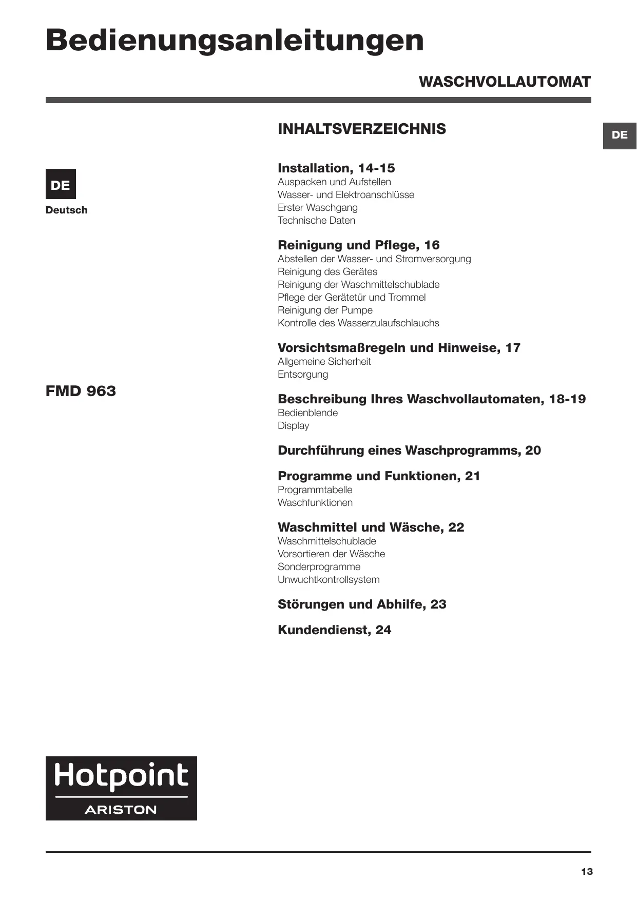 Installation, 14-15 Deutsch Auspacken und Aufstellen Wasser- und Elektroanschlüsse Erster Waschgang Technische Daten Reinigung und Pflege, 16 Abstellen der Wasser- und Stromversorgung Reinigung des Gerätes Reinigung der Waschmittelschublade Pflege der Gerätetür und Trommel Reinigung der Pumpe Kontrolle des Wasserzulaufschlauchs Vorsichtsmaßregeln und Hinweise, 17 Allgemeine Sicherheit Entsorgung FMD 963 Beschreibung Ihres Waschvollautomaten, 18-19 Bedienblende Display Durchführung eines Waschprogramms, 20 Programme und Funktionen, 21 Programmtabelle Waschfunktionen Waschmittel und Wäsche, 22 Waschmittelschublade Vorsortieren der Wäsche Sonderprogramme Unwuchtkontrollsystem Störungen und Abhilfe, 23 Kundendienst, 24
