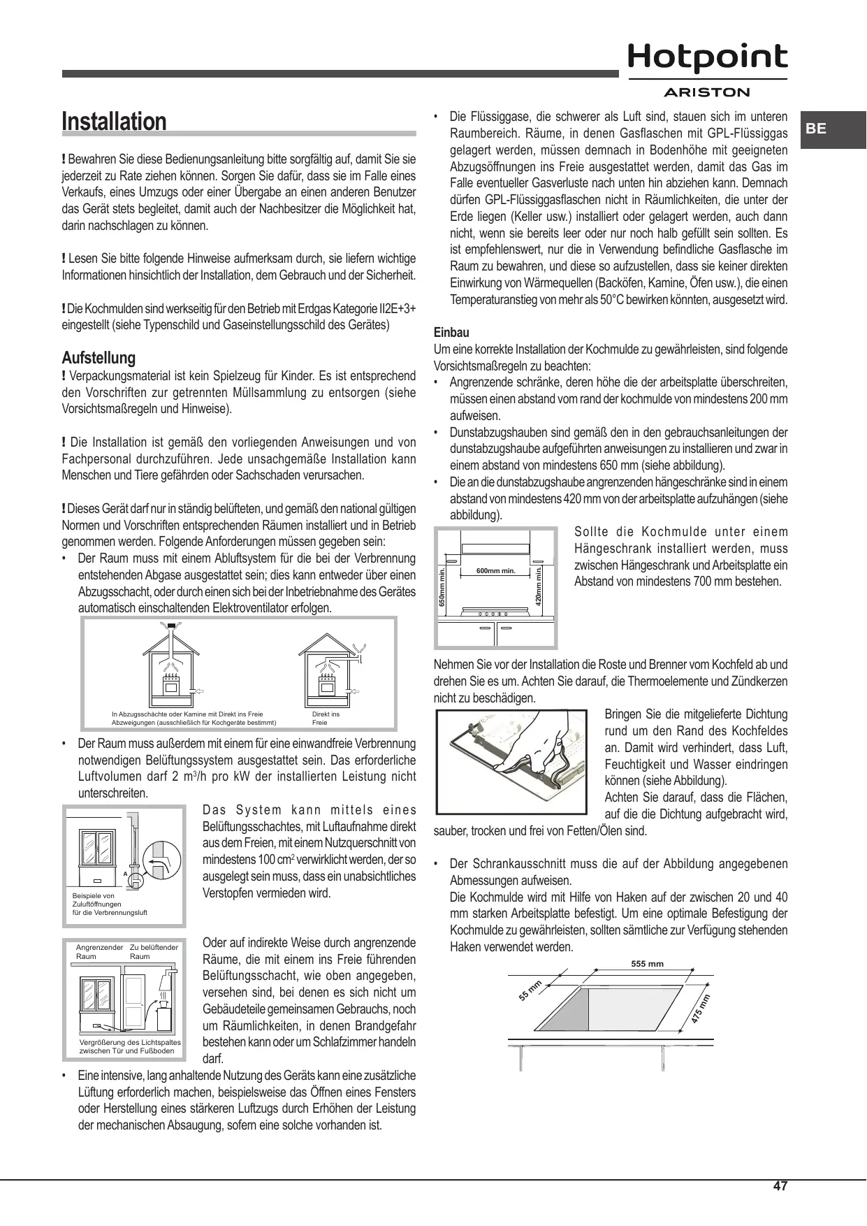 ! Verpackungsmaterial ist kein Spielzeug für Kinder. Es ist entsprechend den Vorschriften zur getrennten Müllsammlung zu entsorgen (siehe Vorsichtsmaßregeln und Hinweise). ! Die Installation ist gemäß den vorliegenden Anweisungen und von Fachpersonal durchzuführen. Jede unsachgemäße Installation kann Menschen und Tiere gefährden oder Sachschaden verursachen. ! Dieses Gerät darf nur in ständig belüfteten, und gemäß den national gültigen Normen und Vorschriften entsprechenden Räumen installiert und in Betrieb genommen werden. Folgende Anforderungen müssen gegeben sein: • Der Raum muss mit einem Abluftsystem für die bei der Verbrennung entstehenden Abgase ausgestattet sein; dies kann entweder über einen Abzugsschacht, oder durch einen sich bei der Inbetriebnahme des Gerätes automatisch einschaltenden Elektroventilator erfolgen.