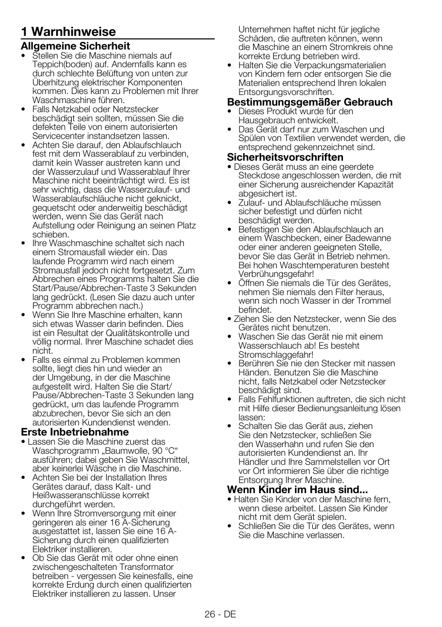 - Das Gerät darf nur zum Waschen und Spülen von Textilien verwendet werden, die entsprechend gekennzeichnet sind. Sicherheitsvorschriften