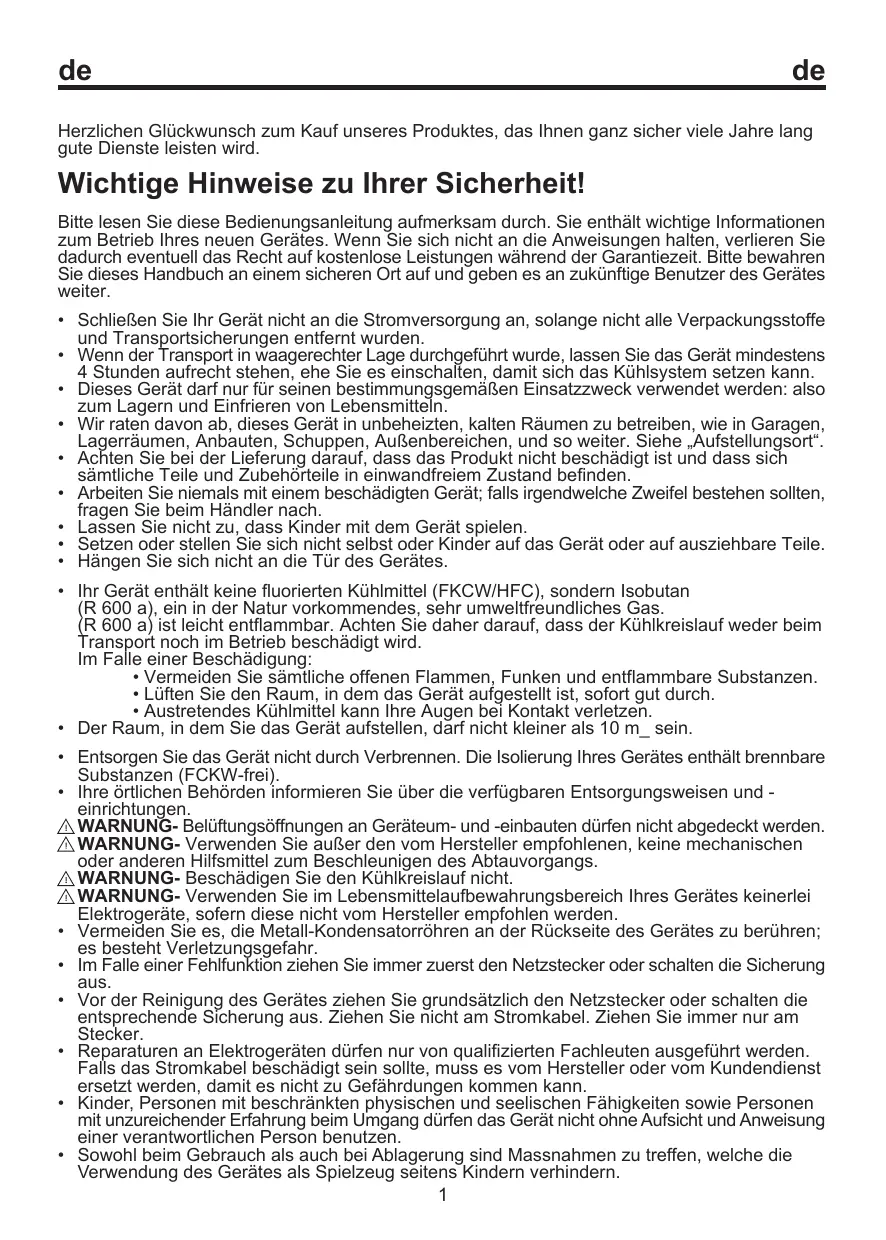 - Entsorgen Sie das Gerät nicht durch Verbrennen. Die Isolierung Ihres Gerätes enthält brennbare Substanzen (FCKW-frei).