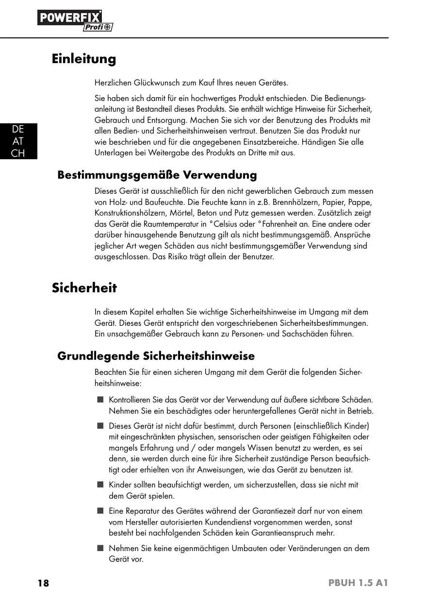 Bestimmungsgemäße Verwendung Dieses Gerät ist ausschließlich für den nicht gewerblichen Gebrauch zum messen von Holz- und Baufeuchte. Die Feuchte kann in z.B. Brennhölzern, Papier, Pappe, Konstruktionshölzern, Mörtel, Beton und Putz gemessen werden. Zusätzlich zeigt das Gerät die Raumtemperatur in °Celsius oder °Fahrenheit an. Eine andere oder darüber hinausgehende Benutzung gilt als nicht bestimmungsgemäß. Ansprüche jeglicher Art wegen Schäden aus nicht bestimmungsgemäßer Verwendung sind ausgeschlossen. Das Risiko trägt allein der Benutzer. Sicherheit In diesem Kapitel erhalten Sie wichtige Sicherheitshinweise im Umgang mit dem Gerät. Dieses Gerät entspricht den vorgeschriebenen Sicherheitsbestimmungen. Ein unsachgemäßer Gebrauch kann zu Personen- und Sachschäden führen. Grundlegende Sicherheitshinweise Beachten Sie für einen sicheren Umgang mit dem Gerät die folgenden Sicherheitshinweise: ■ Kontrollieren Sie das Gerät vor der Verwendung auf äußere sichtbare Schäden. Nehmen Sie ein beschädigtes oder heruntergefallenes Gerät nicht in Betrieb. ■ Dieses Gerät ist nicht dafür bestimmt, durch Personen (einschließlich Kinder) mit eingeschränkten physischen, sensorischen oder geistigen Fähigkeiten oder mangels Erfahrung und / oder mangels Wissen benutzt zu werden, es sei denn, sie werden durch eine für ihre Sicherheit zuständige Person beaufsichtigt oder erhielten von ihr Anweisungen, wie das Gerät zu benutzen ist. ■ Kinder sollten beaufsichtigt werden, um sicherzustellen, dass sie nicht mit dem Gerät spielen. ■ Eine Reparatur des Gerätes während der Garantiezeit darf nur von einem vom Hersteller autorisierten Kundendienst vorgenommen werden, sonst besteht bei nachfolgenden Schäden kein Garantieanspruch mehr. ■ Nehmen Sie keine eigenmächtigen Umbauten oder Veränderungen an dem Gerät vor.
