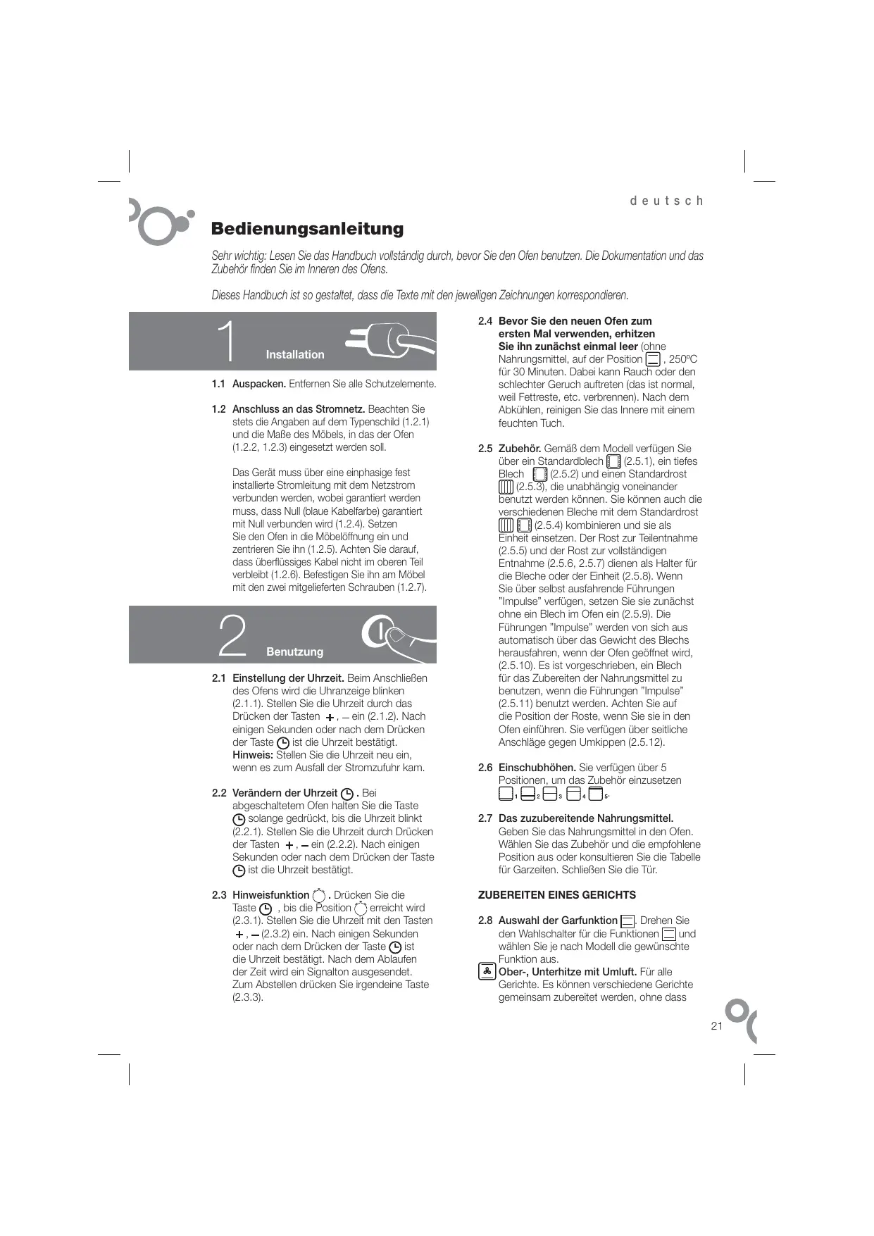 2.4 Bevor Sie den neuen Ofen zum ersten Mal verwenden, erhitzen Sie ihn zunächst einmal leer (ohne , 250ºC Nahrungsmittel, auf der Position für 30 Minuten. Dabei kann Rauch oder den schlechter Geruch auftreten (das ist normal, weil Fettreste, etc. verbrennen). Nach dem Abkühlen, reinigen Sie das Innere mit einem feuchten Tuch. 2.5 Zubehör. Gemäß dem Modell verfügen Sie über ein Standardblech (2.5.1), ein tiefes Blech (2.5.2) und einen Standardrost (2.5.3), die unabhängig voneinander benutzt werden können. Sie können auch die verschiedenen Bleche mit dem Standardrost (2.5.4) kombinieren und sie als Einheit einsetzen. Der Rost zur Teilentnahme (2.5.5) und der Rost zur vollständigen Entnahme (2.5.6, 2.5.7) dienen als Halter für die Bleche oder der Einheit (2.5.8). Wenn Sie über selbst ausfahrende Führungen ”Impulse” verfügen, setzen Sie sie zunächst ohne ein Blech im Ofen ein (2.5.9). Die Führungen ”Impulse” werden von sich aus automatisch über das Gewicht des Blechs herausfahren, wenn der Ofen geöffnet wird, (2.5.10). Es ist vorgeschrieben, ein Blech für das Zubereiten der Nahrungsmittel zu benutzen, wenn die Führungen ”Impulse” (2.5.11) benutzt werden. Achten Sie auf die Position der Roste, wenn Sie sie in den Ofen einführen. Sie verfügen über seitliche Anschläge gegen Umkippen (2.5.12). 2.6 Einschubhöhen. Sie verfügen über 5 Positionen, um das Zubehör einzusetzen . 2.7 Das zuzubereitende Nahrungsmittel. Geben Sie das Nahrungsmittel in den Ofen. Wählen Sie das Zubehör und die empfohlene Position aus oder konsultieren Sie die Tabelle für Garzeiten. Schließen Sie die Tür. ZUBEREITEN EINES GERICHTS . Drehen Sie 2.8 Auswahl der Garfunktion den Wahlschalter für die Funktionen und wählen Sie je nach Modell die gewünschte Funktion aus. Ober-, Unterhitze mit Umluft. Für alle Gerichte. Es können verschiedene Gerichte gemeinsam zubereitet werden, ohne dass 21