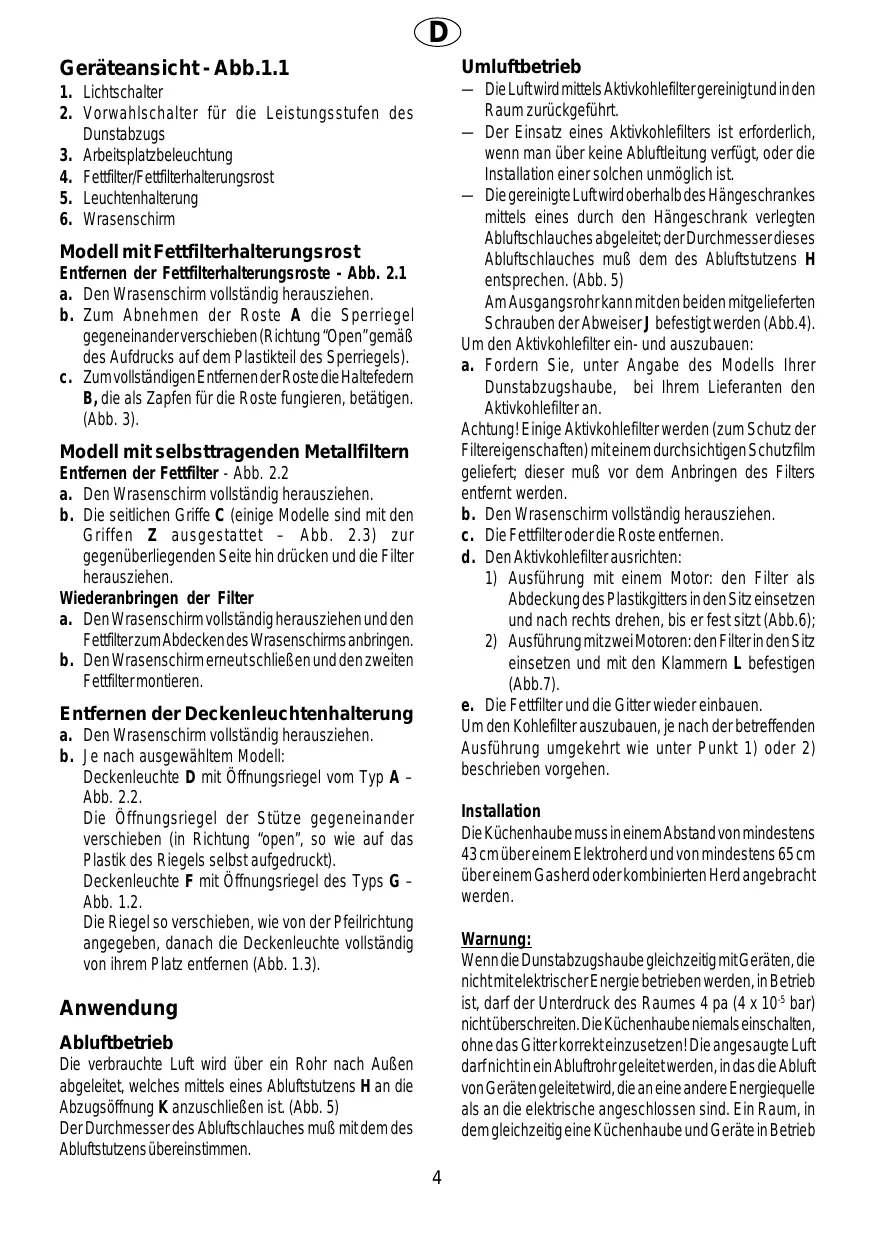 einsetzen und mit den Klammern L befestigen (Abb.7). e. Die Fettfilter und die Gitter wieder einbauen. Um den Kohlefilter auszubauen, je nach der betreffenden Ausführung umgekehrt wie unter Punkt 1) oder 2) beschrieben vorgehen. Modell mit Fettfilterhalterungsrost Entfernen der Fettfilterhalterungsroste - Abb. 2.1 a. Den Wrasenschirm vollständig herausziehen. b. Zum Abnehmen der Roste A die Sperriegel gegeneinander verschieben (Richtung “Open” gemäß des Aufdrucks auf dem Plastikteil des Sperriegels). c. Zum vollständigen Entfernen der Roste die Haltefedern B, die als Zapfen für die Roste fungieren, betätigen. (Abb. 3). Modell mit selbsttragenden Metallfiltern Entfernen der Fettfilter - Abb. 2.2 a. Den Wrasenschirm vollständig herausziehen. b. Die seitlichen Griffe C (einige Modelle sind mit den Griffen Z ausgestattet – Abb. 2.3) zur gegenüberliegenden Seite hin drücken und die Filter herausziehen. Wiederanbringen der Filter a. Den Wrasenschirm vollständig herausziehen und den Fettfilter zum Abdecken des Wrasenschirms anbringen. b. Den Wrasenschirm erneut schließen und den zweiten Fettfilter montieren. Entfernen der Deckenleuchtenhalterung a. Den Wrasenschirm vollständig herausziehen. b. Je nach ausgewähltem Modell: Deckenleuchte D mit Öffnungsriegel vom Typ A – Abb. 2.2. Die Öffnungsriegel der Stütze gegeneinander verschieben (in Richtung “open”, so wie auf das Plastik des Riegels selbst aufgedruckt). Deckenleuchte F mit Öffnungsriegel des Typs G – Abb. 1.2. Die Riegel so verschieben, wie von der Pfeilrichtung angegeben, danach die Deckenleuchte vollständig von ihrem Platz entfernen (Abb. 1.3). Installation Die Küchenhaube muss in einem Abstand von mindestens 43 cm über einem Elektroherd und von mindestens 65 cm über einem Gasherd oder kombinierten Herd angebracht werden. Warnung: Wenn die Dunstabzugshaube gleichzeitig mit Geräten, die nicht mit elektrischer Energie betrieben werden, in Betrieb ist, darf der Unterdruck des Raumes 4 pa (4 x 10-5 bar) nicht überschreiten. Die Küchenhaube niemals einschalten, ohne das Gitter korrekt einzusetzen! Die angesaugte Luft darf nicht in ein Abluftrohr geleitet werden, in das die Abluft von Geräten geleitet wird, die an eine andere Energiequelle als an die elektrische angeschlossen sind. Ein Raum, in dem gleichzeitig eine Küchenhaube und Geräte in Betrieb Anwendung Abluftbetrieb Die verbrauchte Luft wird über ein Rohr nach Außen abgeleitet, welches mittels eines Abluftstutzens H an die Abzugsöffnung K anzuschließen ist. (Abb. 5) Der Durchmesser des Abluftschlauches muß mit dem des Abluftstutzens übereinstimmen.