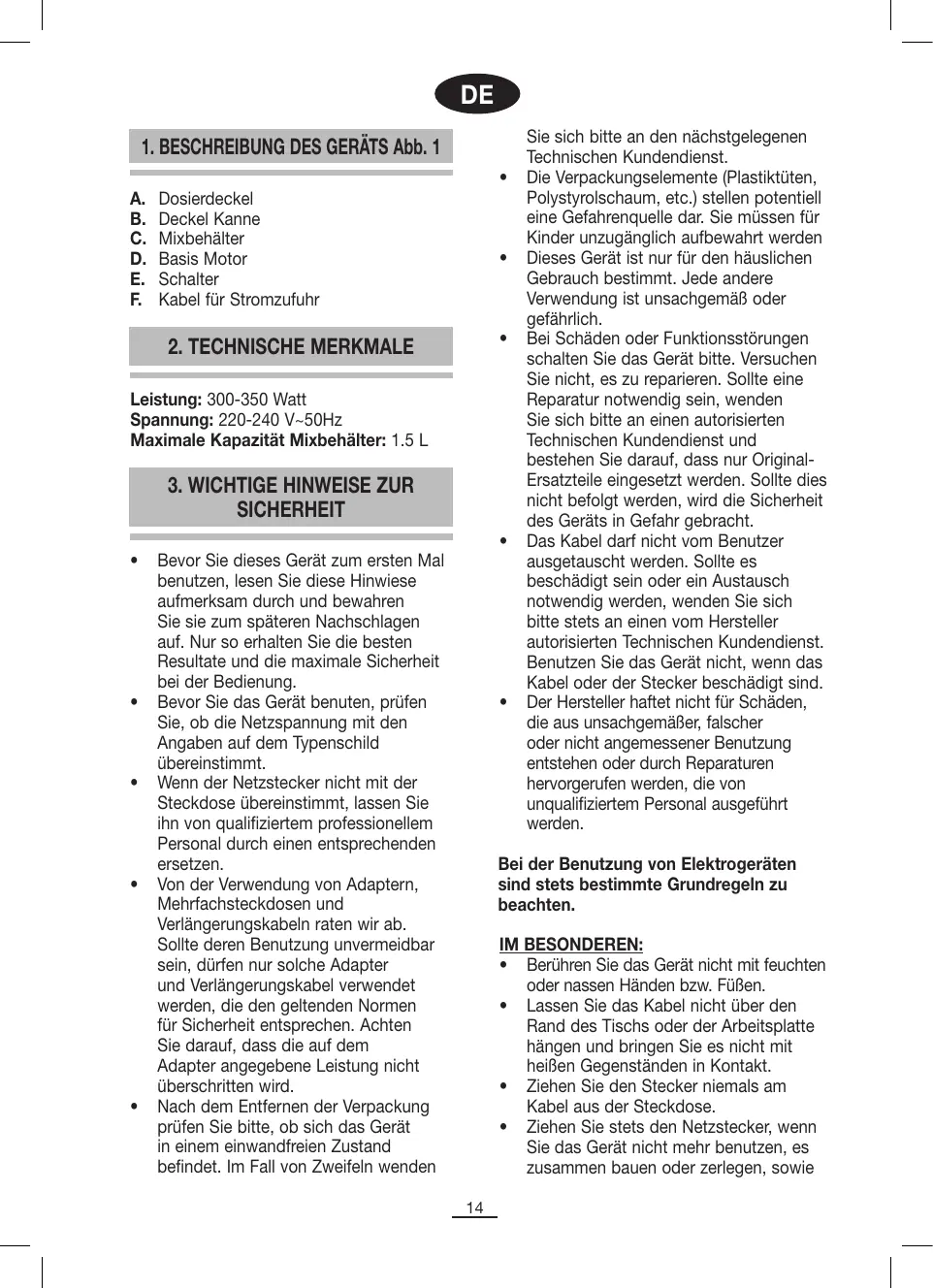 Leistung: 300-350 Watt Spannung: 220-240 V~50Hz Maximale Kapazität Mixbehälter: 1.5 L