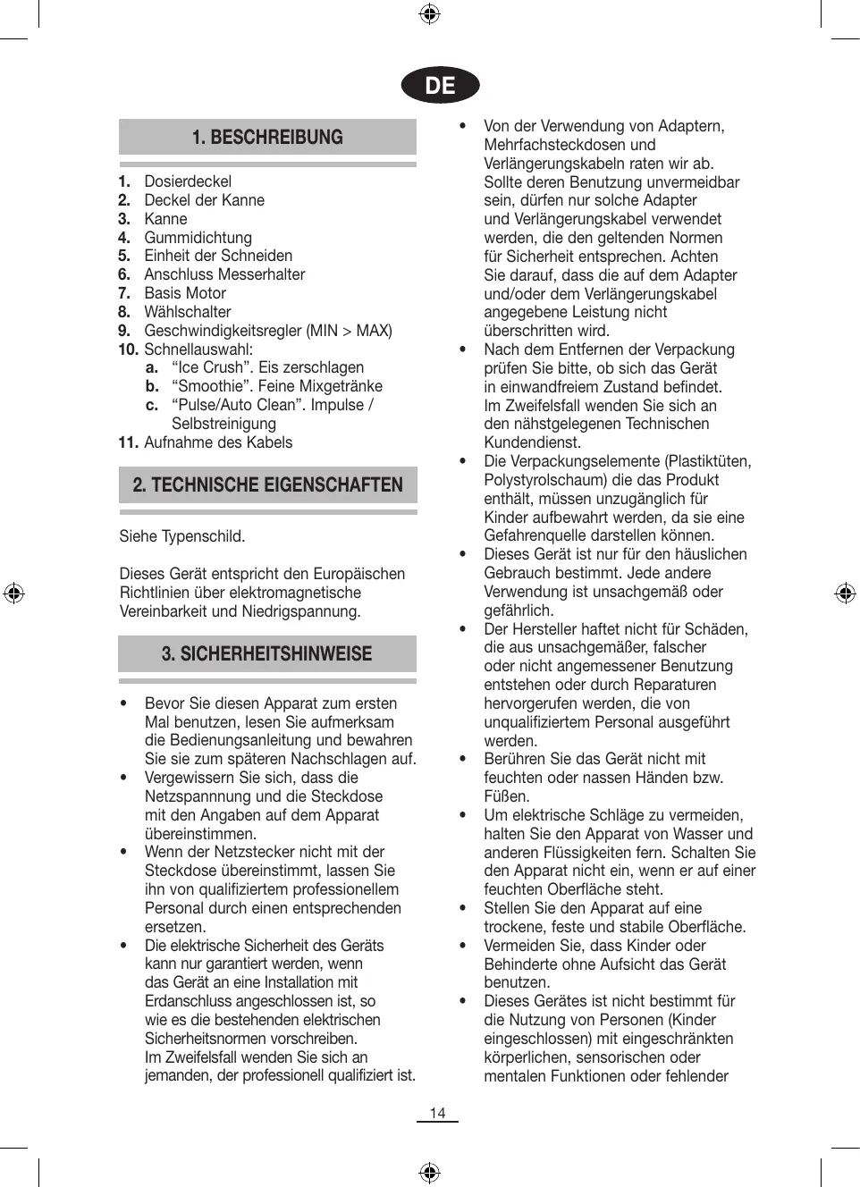 Öffnung in dem Deckel indem Sie ihn gegen den Uhrzeigersinn drehen (Abb. G). Um den Mixer zu zerlegen, zum Beispiel für seine Reinigung, gehen Sie in umgekehrter Reihenfolge der Montage vor. - «Ice Chush» (10.a): Diese Funktion wird benutzt um Eis zu zerschlagen. Der Mixer wird in Intervallen von 30 Sekunden arbeiten. Wenn Sie den Vorgang stoppen wollen, drücken Sie erneut den Knopf. - «Smoothie» (10.b): Diese Funktion wird empfohlen, um Mixgetränke, Pürees oder ähnliches zu bereiten, das Gerät wird während einer Minute unterbrochen funktionieren. Wenn Sie den Vorgang stoppen wollen, drücken Sie erneut den Knopf. - «Pulse/Auto Clean» (10.c): Um mit kurzen Impulsen zu arbeiten, drücken Sie den Knopf und drücken Sie ihn alternierend erneut, bis Sie die gewünschte Mischung erreicht haben. Wenn Sie den Knopf nicht erneut drücken, wird das Gerät während 45 Sekunden mit verschiedenen Zeiten und Geschwindigkeiten drehen. Diese Funktion ist wichtig für die Reinigung der Kanne, deshalb schütten Sie zur Reinigung Wasser mit etwas Reinigungsmittel. Wenn der Vorgang abgeschlossen ist, schalten Sie den Mixer ab, indem Sie den Schalter (8) auf die Position OFF stellen und ziehen Sie den Netzstecker. Um den Inhalt auszuschütten, nehmen Sie den Deckel (2) ab (mit dem Dosierdeckel) des Deckels ab und nehmen Sie die Kanne (3) von der Basis des Motors ab (7), um den Inhalt aus der Kanne zu schütten. Gehen Sie nun zur Reinigung über. INBETRIEBNAHME