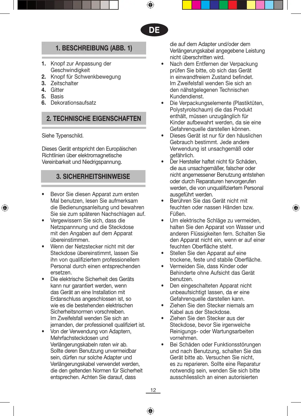 Technischen Kundendienst und bestehen Sie darauf, dass nur OriginalErsatzteile eingesetzt werden. Sollte das Kabel beschädigt sein, wenden Sie sich bitte zum Austausch an einen autorisierten Technischen Kundendienst. Schützen Sie das Gerät vor atmosphärischen Erregern (Regen, Sonne, Eis, etc.) Benutzen und stellen Sie weder das Gerät noch Teile davon in die Nähe oder auf heisse Oberflächen (elektrische Heizplatten, Gaskocher oder Öfen). Benutzen Sie weder Spülmittel noch harte Reinigungstücher, um den Apparat zu reinigen. Die heissen Oberflächen nicht berühren. Benutzen Sie die Henkel und Griffe. Vermeiden Sie den Kabelkontakt mit den heissen Flächen des Apparats . Decken Sie das Kabel nicht mit Teppichen oder ähnlichem ab. Verlegen Sie das Kabel außerhalb der Laufzonen, so dass man nicht über es stolpern kann. Um zu garantieren, dass die Eingangsund Ausgangsgitter nicht blockiert werden können, halten Sie einen Abstand von mindestens 20cm von der Wand. Stellen Sie den Ventilator nicht unter Gardinen oder ähnliches. Stecken Sie keine Gegenstände in das Gitter. Stellen Sie das Gerät nicht in die Nähe von Hitzequellen oder auf heiße Oberflächen. Richten Sie den Luftstrom nicht direkt auf ein Baby oder eine kranke Person.