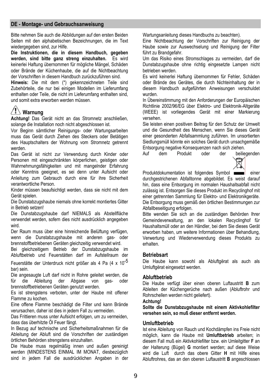 DE - Montage- und Gebrauchsanweisung Bitte nehmen Sie auch die Abbildungen auf den ersten Beiden Seiten mit den alphabetischen Bezeichnungen, die im Text wiedergegeben sind, zur Hilfe. Die Instruktionen, die in diesem Handbuch, gegeben werden, sind bitte ganz streng einzuhalten. Es wird keinerlei Haftung übernommen für mögliche Mängel, Schäden oder Brände der Küchenhaube, die auf die Nichtbeachtung der Vorschriften in diesem Handbuch zurückzuführen sind. Hinweis: Die mit dem (*) gekennzeichneten Teile sind Zubehörteile, die nur bei einigen Modellen im Lieferumfang enthalten oder Teile, die nicht im Lieferumfang enthalten sind, und somit extra erworben werden müssen. Wartungsanleitung dieses Handbuchs zu beachten). Eine Nichtbeachtung der Vorschriften zur Reinigung der Haube sowie zur Auswechselung und Reinigung der Filter führt zu Brandgefahr. Um das Risiko eines Stromschlages zu vermeiden, darf die Dunstabzugshaube ohne richtig eingesetzte Lampen nicht betrieben werden. Es wird keinerlei Haftung übernommen für Fehler, Schäden oder Brände des Gerätes, die durch Nichteinhaltung der in diesem Handbuch aufgeführten Anweisungen verschuldet wurden. In Übereinstimmung mit den Anforderungen der Europäischen Richtlinie 2002/96/EG über Elektro- und Elektronik-Altgeräte (WEEE) ist vorliegendes Gerät mit einer Markierung versehen. Sie leisten einen positiven Beitrag für den Schutz der Umwelt und die Gesundheit des Menschen, wenn Sie dieses Gerät einer gesonderten Abfallsammlung zuführen. Im unsortierten Siedlungsmüll könnte ein solches Gerät durch unsachgemäße Entsorgung negative Konsequenzen nach sich ziehen. Auf dem Produkt oder der beiliegenden Warnung Achtung! Das Gerät nicht an das Stromnetz anschließen, solange die Installation noch nicht abgeschlossen ist. Vor Beginn sämtlicher Reinigungs- oder Wartungsarbeiten muss das Gerät durch Ziehen des Steckers oder Betätigen des Hauptschalters der Wohnung vom Stromnetz getrennt werden. Das Gerät ist nicht zur Verwendung durch Kinder oder Personen mit eingeschränkten körperlichen, geistigen oder Wahrnehmungsfähigkeiten und mit mangelnder Erfahrung oder Kenntnis geeignet, es sei denn unter Aufsicht oder Anleitung zum Gebrauch durch eine für ihre Sicherheit verantwortliche Person. Kinder müssen beaufsichtigt werden, dass sie nicht mit dem Gerät spielen. Die Dunstabzugshaube niemals ohne korrekt montiertes Gitter in Betrieb setzen! Die Dunstabzugshaube darf NIEMALS als Abstellfläche verwendet werden, sofern dies nicht ausdrücklich angegeben wird. Der Raum muss über eine hinreichende Belüftung verfügen, wenn die Dunstabzugshaube mit anderen gas- oder brennstoffbetriebenen Geräten gleichzeitig verwendet wird. Bei gleichzeitigem Betrieb der Dunstabzugshaube im Abluftbetrieb und Feuerstätten darf im Aufstellraum der Feuerstätte der Unterdruck nicht größer als 4 Pa (4 x 10-5 einer Produktdokumentation ist folgendes Symbol durchgestrichenen Abfalltonne abgebildet. Es weist darauf hin, dass eine Entsorgung im normalen Haushaltsabfall nicht zulässig ist. Entsorgen Sie dieses Produkt im Recyclinghof mit einer getrennten Sammlung für Elektro- und Elektronikgeräte. Die Entsorgung muss gemäß den örtlichen Bestimmungen zur Abfallbeseitigung erfolgen. Bitte wenden Sie sich an die zuständigen Behörden Ihrer Gemeindeverwaltung, an den lokalen Recyclinghof für Haushaltsmüll oder an den Händler, bei dem Sie dieses Gerät erworben haben, um weitere Informationen über Behandlung, Verwertung und Wiederverwendung dieses Produkts zu erhalten. Betriebsart Die Haube kann sowohl als Abluftgërat als auch als Umluftgërat eingesetzt werden. bar) sein. Die angesaugte Luft darf nicht in Rohre geleitet werden, die für die Ableitung der Abgase von gas- oder brennstoffbetriebenen Geräten genutzt werden. Es ist strengstens verboten, unter der Haube mit offener Flamme zu kochen. Eine offene Flamme beschädigt die Filter und kann Brände verursachen, daher ist dies in jedem Fall zu vermeiden. Das Frittieren muss unter Aufsicht erfolgen, um zu vermeiden, dass das überhitzte Öl Feuer fängt. In Bezug auf technische und Sicherheitsmaßnahmen für die Ableitung der Abluft sind die Vorschriften der zuständigen örtlichen Behörden strengstens einzuhalten. Die Haube muss regelmäßig innen und außen gereinigt werden (MINDESTENS EINMAL IM MONAT, diesbezüglich sind in jedem Fall die ausdrücklichen Angaben in der Abluftbetrieb Die Haube verfügt über einen oberen Luftaustritt B zum Ableiten der Küchengerüche nach außen (Abluftrohr und Rohrschellen werden nicht geliefert). Achtung! Sollte die Dunstabzugshaube mit einem Aktivkohlefilter versehen sein, so muß dieser entfernt werden. Umluftbetrieb Ist eine Ableitung von Rauch und Kochdämpfen ins Freie nicht möglich, kann die Haube mit Umluftbetrieb arbeiten; in diesem Fall muß ein Aktivkohlefilter bzw. ein Umleitgitter F an der Halterung (Bügel) G montiert werden; auf diese Weise wird die Luft durch das obere Gitter H mit Hilfe eines Abluftrohres, das an den oberen Luftaustritt B angeschlossen