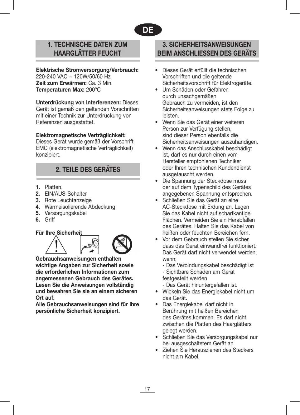 - Das Gerät darf nicht mit entflammbaren Materialien in Berührung kommen. Ebenfalls darf es nicht in der Nähe von entflammbaren Materialien benutzt werden, da die Glättungsplatten Temperaturen von ca. 200 ºC erreichen.
