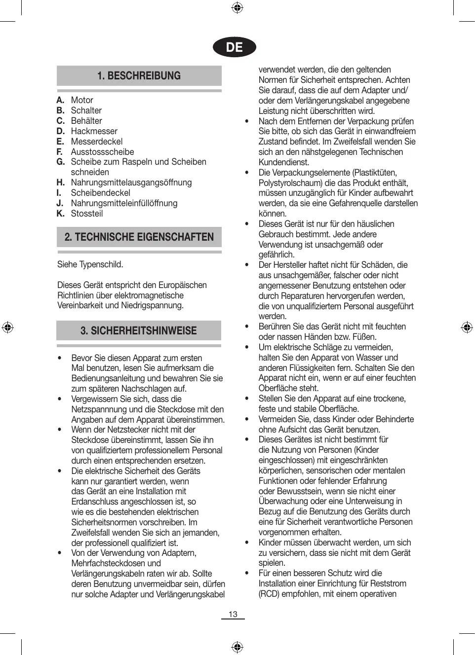 Motor Schalter Behälter Hackmesser Messerdeckel Ausstossscheibe Scheibe zum Raspeln und Scheiben schneiden H. Nahrungsmittelausgangsöffnung I. Scheibendeckel J. Nahrungsmitteleinfüllöffnung K. Stossteil