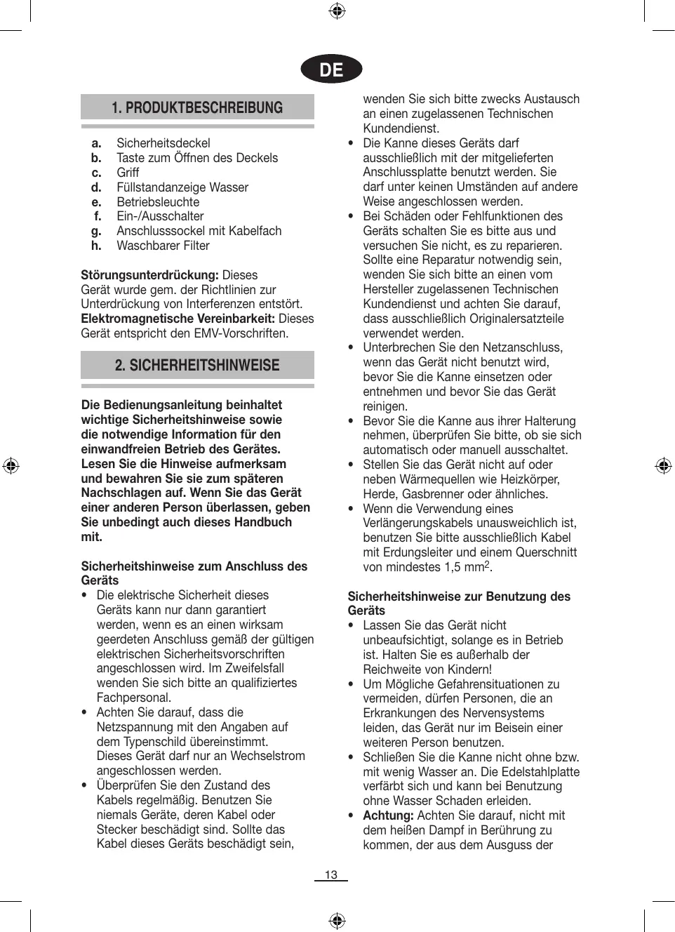 VORGESEHENEN ZWECK Dieses Gerät darf nur zum Erhitzen und Kochen von Wasser im Rahmen des häuslichen Gebrauchs benutzt werden. Gießen Sie niemals Milch, Suppen, Kaffee oder Tee, etc. in die Kanne. Der Hersteller übernimmt keine Haftung für Schäden, die aus unsachgemäßer Handhabung, falscher Bedienung oder Reparaturen entstehen, die von unqualifiziertem Personal ausgeführt wurden. In den genannten Fällen findet die Garantie keine Anwendung.