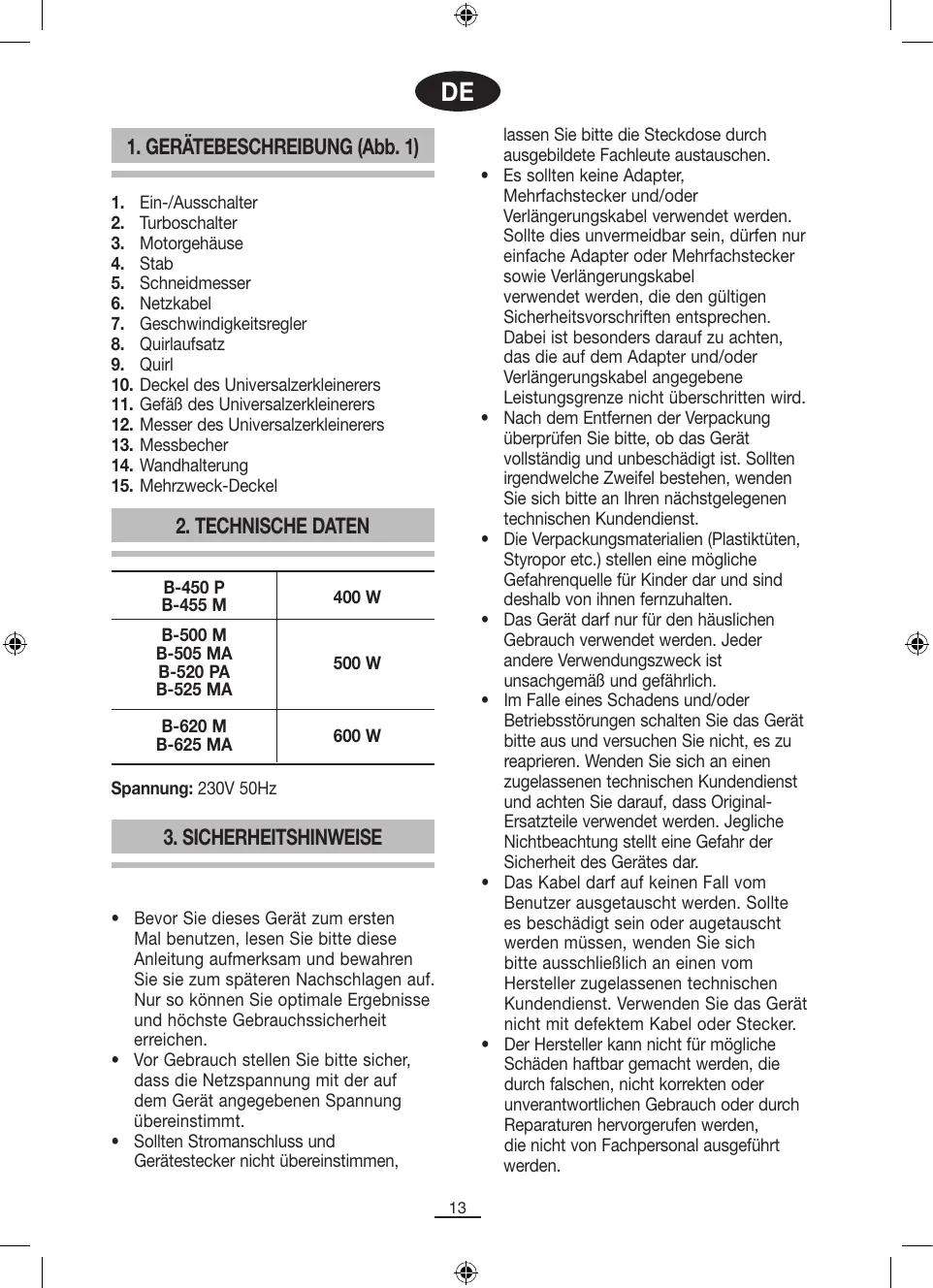 - Kein Teil des Gerätes darf auf oder in der Nähe von heißen Flächen (Gasoder Elektrokochplatten, Herden etc.) verwendet oder abgestellt werden. Handhabung des Quirls Der Quirl ist für die Zubereitung lockerer Speisen wie beispielsweise Saucen, Suppen, Mayonnaise oder Brei geeignet. Um das gewünschte Zubehörteil zu verwenden, stecken Sie es in das Motorgehäuse und drehen bis zum Anschlag gegen den Uhrzeigersinn. Ist der Stab eingepasst (4), schließen Sie das Gerät ans Stromnetz an. Füllen Sie die zu schlagenden Zutaten in ein geeignetes Gefäß und tauchen Sie den Mixstab vertikal ein wie in Abbildung 2. gezeigt. Drücken Sie den Ein-/Ausschalter (1). Bei den Modellen B-520PA, B-525MA, B-620M und B-625MA stellen Sie durch Drehung des Geschwindigkeitsreglers die Geschwindigkeit ein (7). Zum Schlagen mit maximaler Geschwindigkeit können Sie den Turboschalter drücken (2). Handhabung des Mixstabs Führen Sie den Quirl bis zum Einrasten in den Aufsatz ein (Abb. 5). Danach befestigen Sie den Quirl (Abb. 6). Führen Sie den Stab in den Behälter ein, schließen ihn ans Stromnetz an und drücken den Ein/Ausschalter zum Start. Zum Einstellen der gewünschten Geschwindigkeit betätigen Sie den Gescchwindigkeitsregler (dies bezieht sich nur auf die Modelle B-520PA, B-505MA, B-525MA und B-625MA) oder stellen den Turboschalter auf Turbo-Modus. Zum Schlagen können Sie den Becher (13) oder einen anderen Behälter verwenden. Sie können den Inhalt in der Schale mit dem dazugehörigen Deckel aufbewahren.