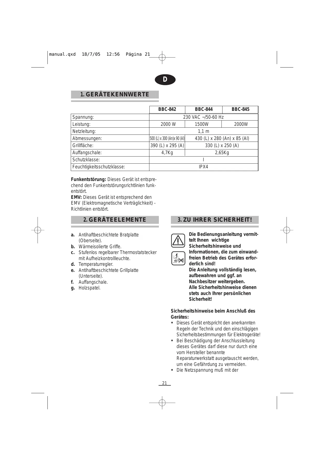 4. UTILISATION CONFORME AUX PRESCRIPTIONS L'appareil est exclusivement destiné à faire des grillades ou cuire des produits alimentaires (surtout viandes, poissons et légumes). Si l´appareil sert à une autre utilisation, est manipulé non correctement ou est réparé par une personne non qualifiée, aucune garantie n´est assurée pour les dommages qui pourraient éventuellement en découler. Les prestations de garantie sont aussi exclues dans ces cas-là.