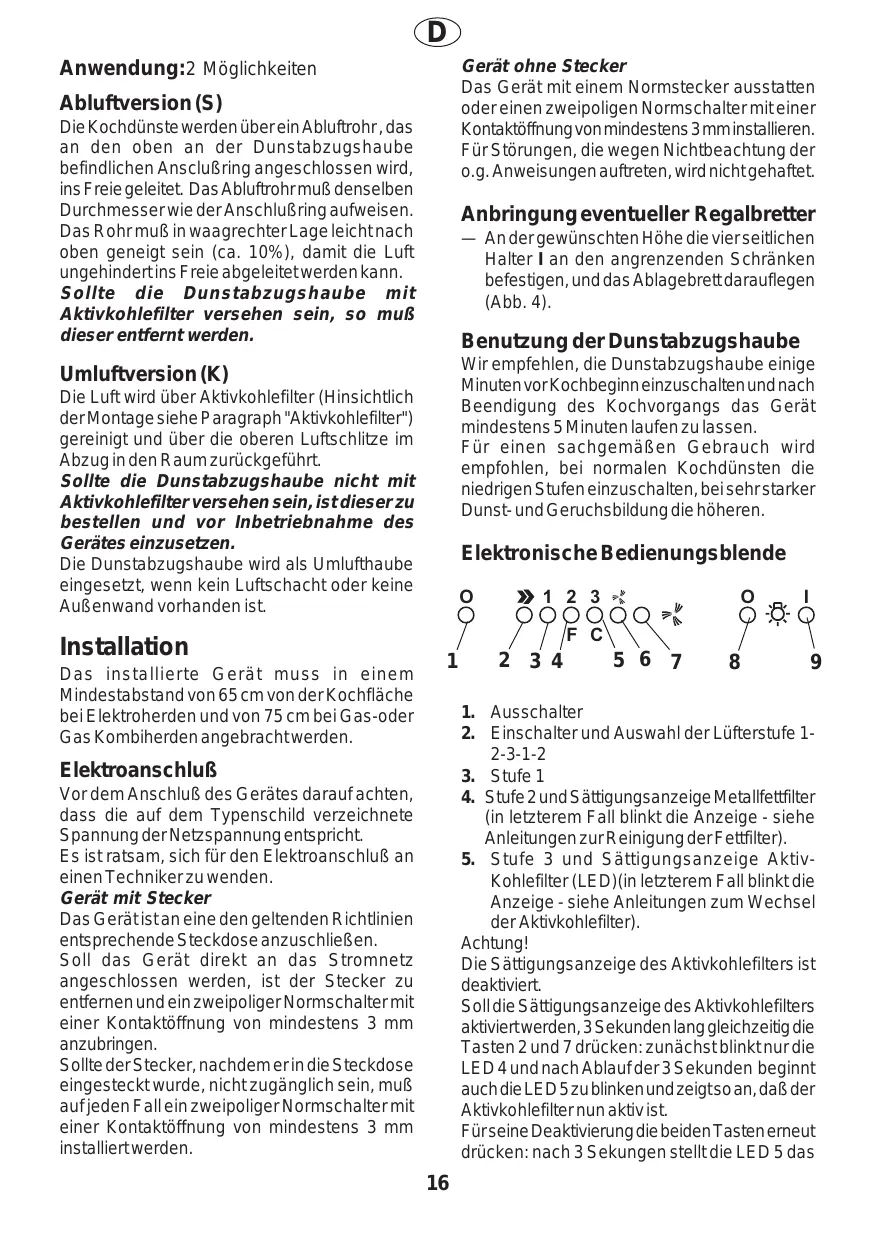 Gerät ohne Stecker Das Gerät mit einem Normstecker ausstatten oder einen zweipoligen Normschalter mit einer Kontaktöffnung von mindestens 3 mm installieren. Für Störungen, die wegen Nichtbeachtung der o.g. Anweisungen auftreten, wird nicht gehaftet. Anwendung:2 Möglichkeiten Abluftversion (S) Die Kochdünste werden über ein Abluftrohr , das an den oben an der Dunstabzugshaube befindlichen Ansclußring angeschlossen wird, ins Freie geleitet. Das Abluftrohr muß denselben Durchmesser wie der Anschlußring aufweisen. Das Rohr muß in waagrechter Lage leicht nach oben geneigt sein (ca. 10%), damit die Luft ungehindert ins Freie abgeleitet werden kann. Sollte die Dunstabzugshaube mit Aktivkohlefilter versehen sein, so muß dieser entfernt werden. Anbringung eventueller Regalbretter — An der gewünschten Höhe die vier seitlichen Halter I an den angrenzenden Schränken befestigen, und das Ablagebrett darauflegen (Abb. 4). Benutzung der Dunstabzugshaube Wir empfehlen, die Dunstabzugshaube einige Minuten vor Kochbeginn einzuschalten und nach Beendigung des Kochvorgangs das Gerät mindestens 5 Minuten laufen zu lassen. Für einen sachgemäßen Gebrauch wird empfohlen, bei normalen Kochdünsten die niedrigen Stufen einzuschalten, bei sehr starker Dunst- und Geruchsbildung die höheren. Umluftversion (K) Die Luft wird über Aktivkohlefilter (Hinsichtlich der Montage siehe Paragraph "Aktivkohlefilter") gereinigt und über die oberen Luftschlitze im Abzug in den Raum zurückgeführt. Sollte die Dunstabzugshaube nicht mit Aktivkohlefilter versehen sein, ist dieser zu bestellen und vor Inbetriebnahme des Gerätes einzusetzen. Die Dunstabzugshaube wird als Umlufthaube eingesetzt, wenn kein Luftschacht oder keine Außenwand vorhanden ist. Installation Das installierte Gerät muss in einem Mindestabstand von 65 cm von der Kochfläche bei Elektroherden und von 75 cm bei Gas-oder Gas Kombiherden angebracht werden. Elektronische Bedienungsblende