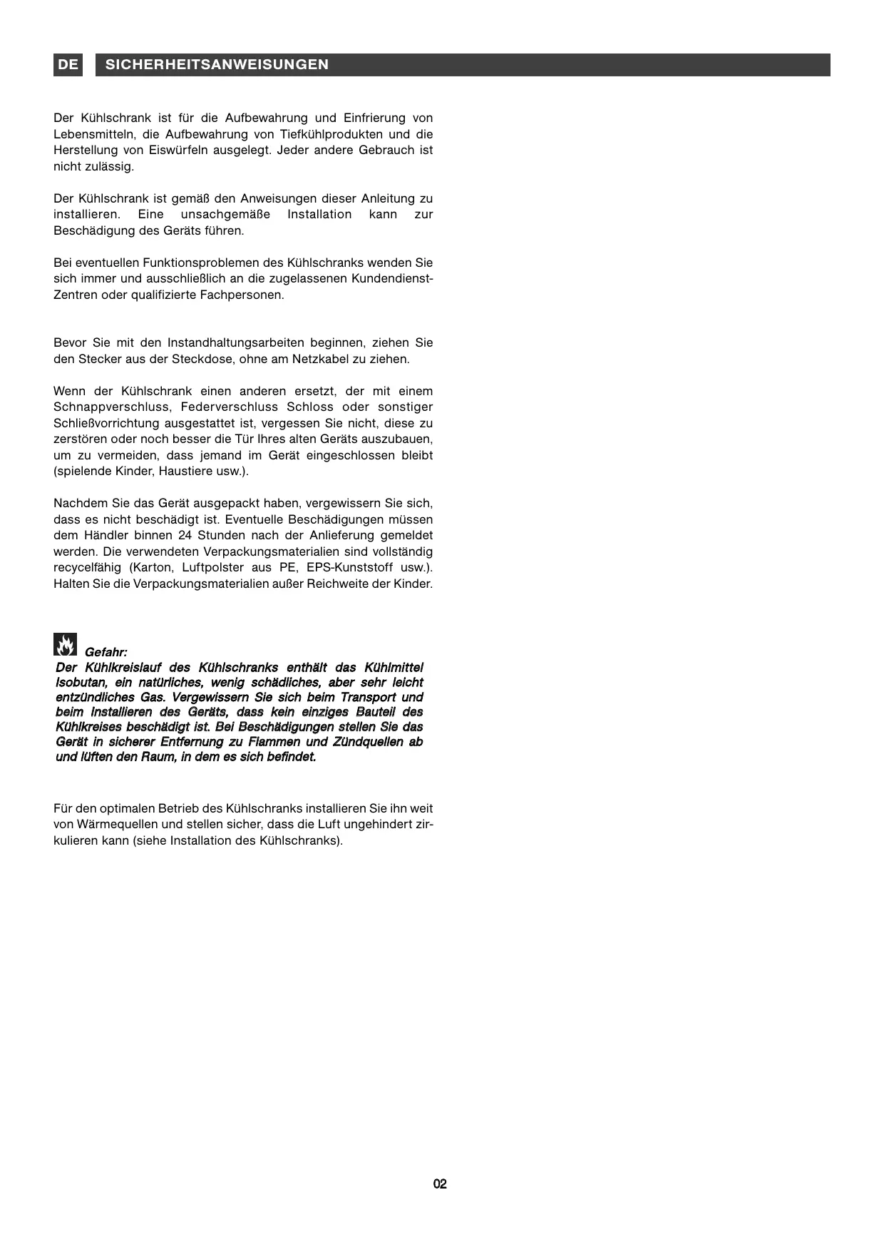 SICHERHEITSANWEISUNGEN Der Kühlschrank ist für die Aufbewahrung und Einfrierung von Lebensmitteln, die Aufbewahrung von Tiefkühlprodukten und die Herstellung von Eiswürfeln ausgelegt. Jeder andere Gebrauch ist nicht zulässig. Der Kühlschrank ist gemäß den Anweisungen dieser Anleitung zu installieren. Eine unsachgemäße Installation kann zur Beschädigung des Geräts führen. Bei eventuellen Funktionsproblemen des Kühlschranks wenden Sie sich immer und ausschließlich an die zugelassenen KundendienstZentren oder qualifizierte Fachpersonen. Bevor Sie mit den Instandhaltungsarbeiten beginnen, ziehen Sie den Stecker aus der Steckdose, ohne am Netzkabel zu ziehen. Wenn der Kühlschrank einen anderen ersetzt, der mit einem Schnappverschluss, Federverschluss Schloss oder sonstiger Schließvorrichtung ausgestattet ist, vergessen Sie nicht, diese zu zerstören oder noch besser die Tür Ihres alten Geräts auszubauen, um zu vermeiden, dass jemand im Gerät eingeschlossen bleibt (spielende Kinder, Haustiere usw.). Nachdem Sie das Gerät ausgepackt haben, vergewissern Sie sich, dass es nicht beschädigt ist. Eventuelle Beschädigungen müssen dem Händler binnen 24 Stunden nach der Anlieferung gemeldet werden. Die verwendeten Verpackungsmaterialien sind vollständig recycelfähig (Karton, Luftpolster aus PE, EPS-Kunststoff usw.). Halten Sie die Verpackungsmaterialien außer Reichweite der Kinder. Gefahr: Der Kühlkreislauf des Kühlschranks enthält das Kühlmittel Isobutan, ein natürliches, wenig schädliches, aber sehr leicht entzündliches Gas. Vergewissern Sie sich beim Transport und beim Installieren des Geräts, dass kein einziges Bauteil des Kühlkreises beschädigt ist. Bei Beschädigungen stellen Sie das Gerät in sicherer Entfernung zu Flammen und Zündquellen ab und lüften den Raum, in dem es sich befindet. Für den optimalen Betrieb des Kühlschranks installieren Sie ihn weit von Wärmequellen und stellen sicher, dass die Luft ungehindert zirkulieren kann (siehe Installation des Kühlschranks).