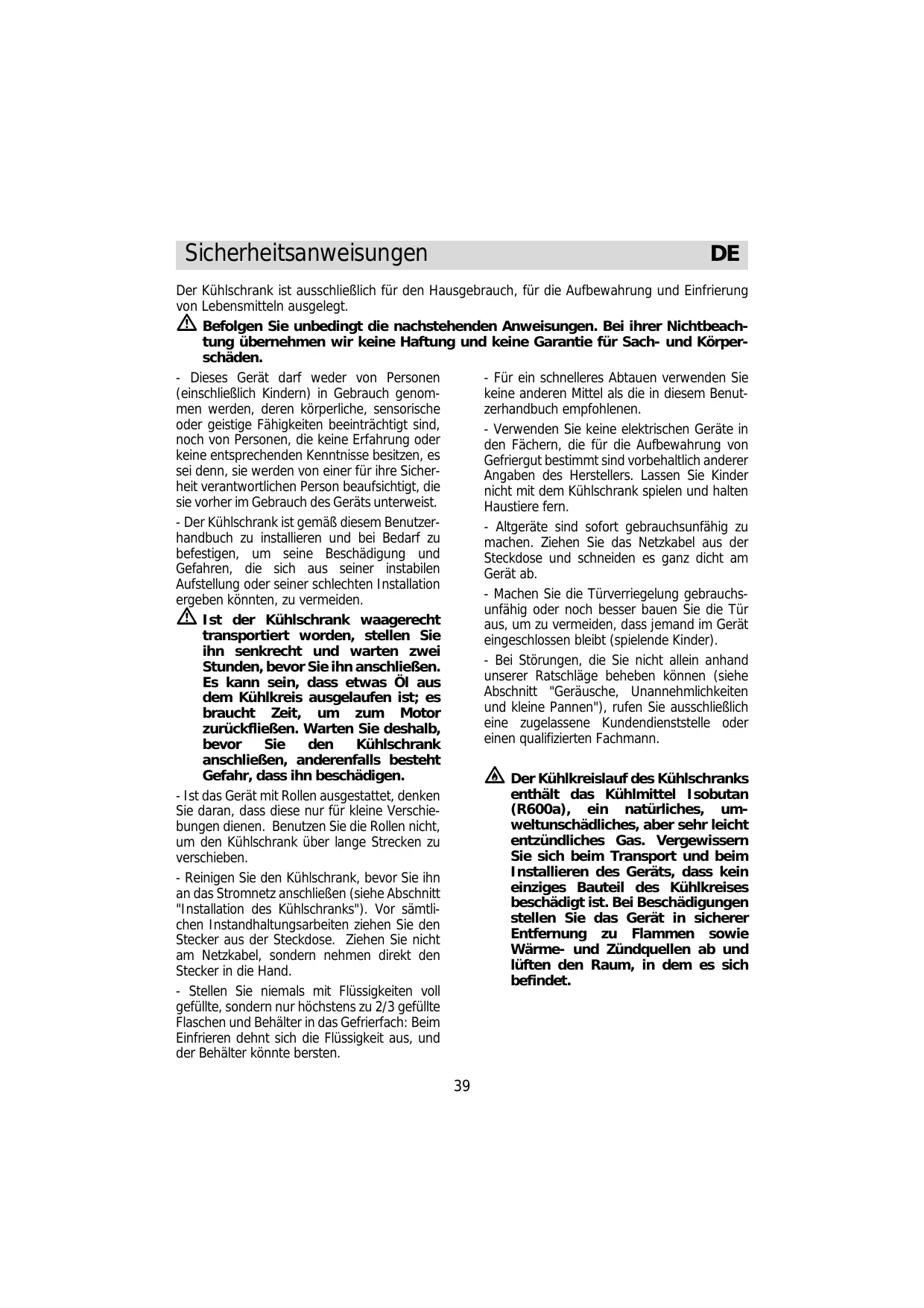 - N’utilisez aucun autre moyen que ceux que nous vous recommandons dans ce guide pour accélérer le dégivrage. - N’utilisez pas d’appareils électriques à l’intérieur des compartiments destinés à la conservation des aliments congelés, sauf recommandation contraire du fabricant. -Ne laissez pas les enfants jouer avec l’appareil, éloignez les animaux domestiques. - Les appareils usagés doivent immédiatement être rendus inutilisables. Débranchez et coupez le câble d’alimentation au ras de l’appareil. Rendez la fermeture de la porte inutilisable, ou mieux encore, démontez la porte afin d’éviter par exemple qu’un enfant ou un animal ne risque de rester enfermé à l’intérieur en jouant. - Si des incidents se produisent et que vous ne pouvez les résoudre grâce aux conseils que nous vous donnons (voir chapitre «Anomalies de fonctionnement»), faites appel exclusivement aux centres de service après-vente agréés ou bien à un professionnel qualifié. Le circuit de réfrigération de votre appareil renferme de l’isobutane réfrigérant (R600a), un gaz naturel non polluant mais néanmoins inflammable. Pendant le transport et l’installation de votre appareil, assurez vous qu’aucun des composants du circuit de réfrigération n’ait été endommagé. En cas de dommage, tenez votre appareil à l’écart des flammes et de toute source de chaleur ou d’inflammation, et aérez la pièce où il se trouve.