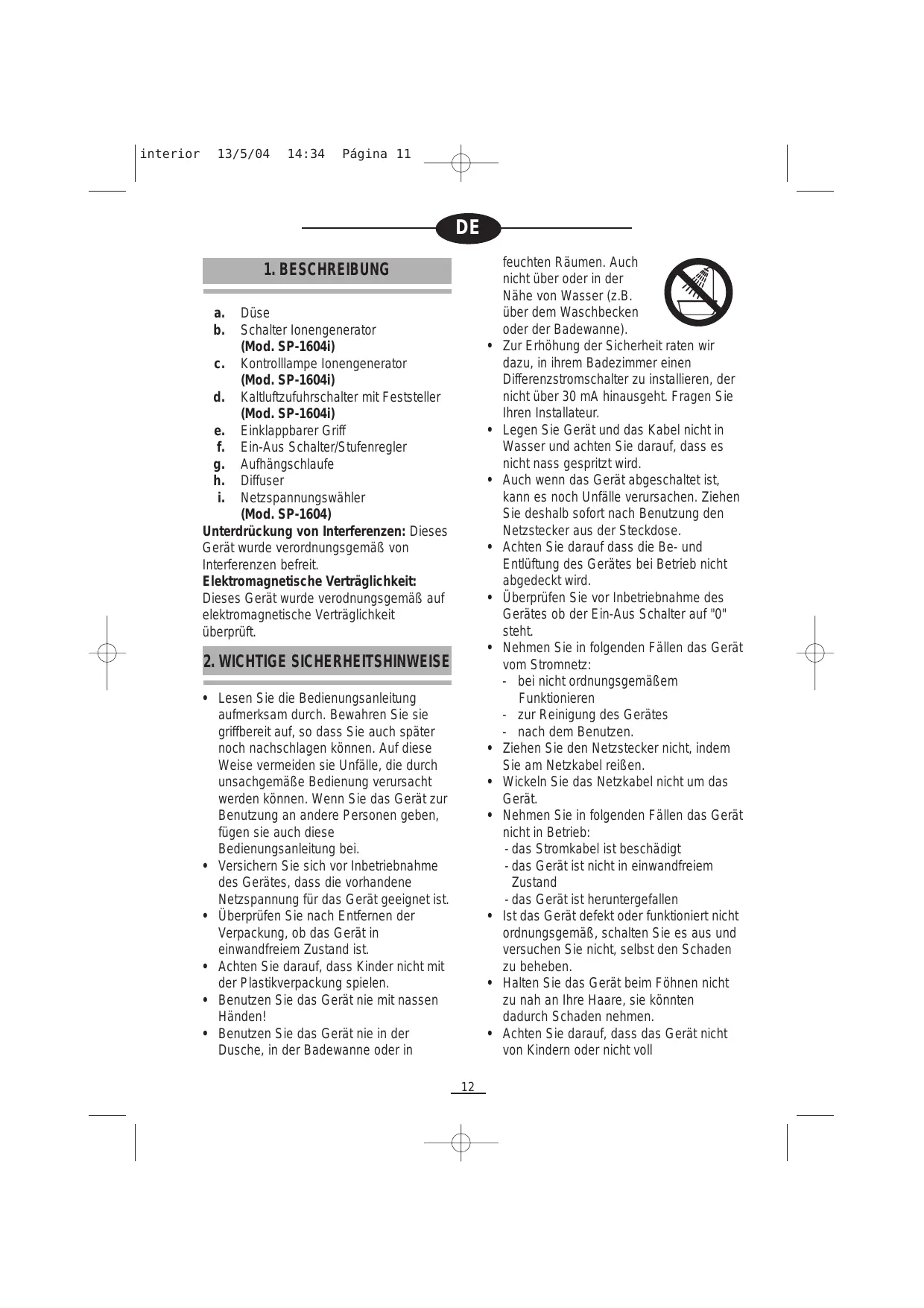 Générateur d’ions: Le modèle SP-1604i est doté d’un générateur d’ions. Cette fonction rehaussera la brillance de vos cheveux tout en les protégeant des charges
