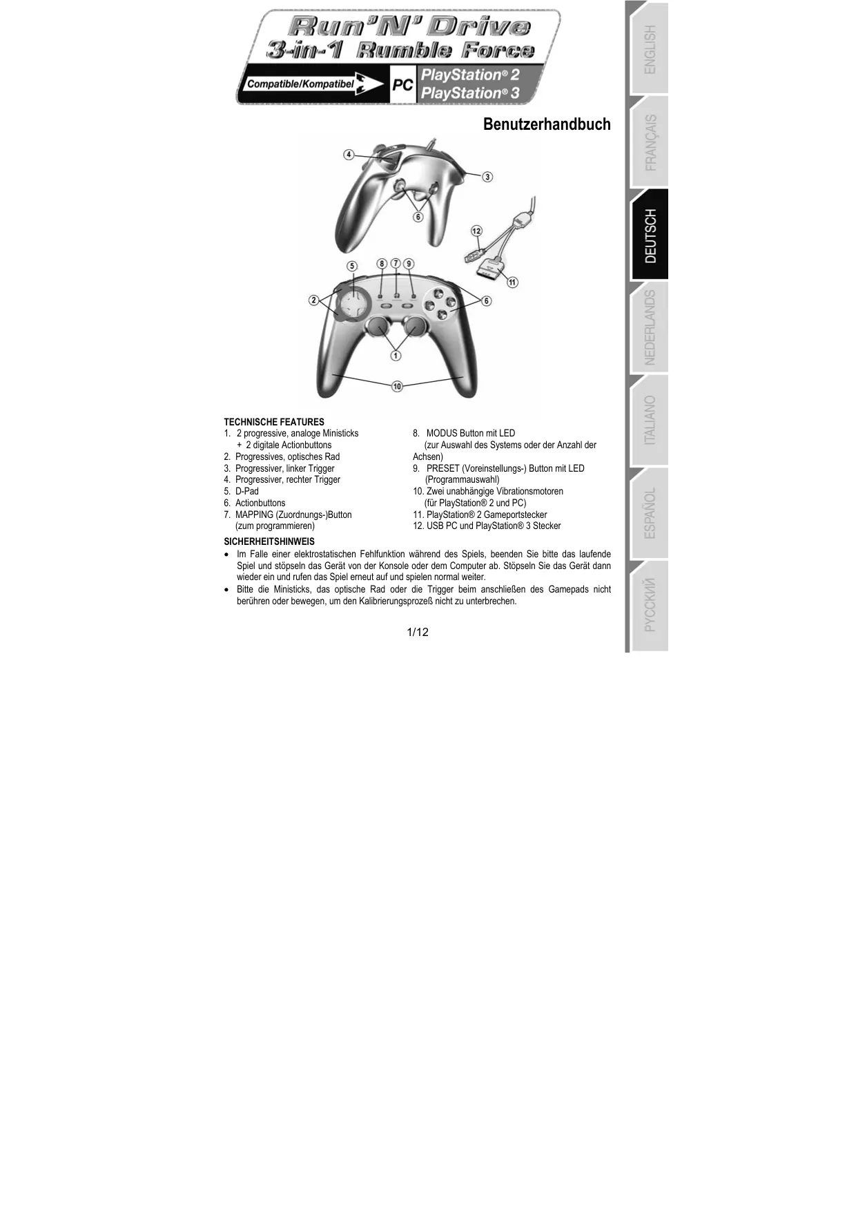 PLAYSTATION® 3 INSTALLATION AUF DER PLAYSTATION® 3 1. Stecken Sie den USB Stecker (12) in einen freien USB Port Ihrer Konsole. 2. Schalten Sie die Konsole ein. 3. Schalten Sie Ihr Gamepad in den “PS3” Modus um = der MODUS Button sollte AUS sein (falls nötig, den Button solange drücken bis er ausschaltet). 4. Starten Sie das Spiel. Sie können nun spielen! “PLAYSTATION® 3” MODUS KONFIGURATION DER “AUTOMATISCHEN VOREINSTELLUNG” AUF PLAYSTATION® 3 “PS3” mode MODUS Button ist AUS Hier: • “Optisches Rad” mit der “Links/Rechts” Richtung auf dem linken Ministick assoziiert • “Rechter” Trigger mit der “Hoch” Richtung auf dem rechten Ministick assoziiert • “Linker” Trigger mit der “Runter” Richtung auf dem rechten Ministick assoziiert Wichtige Anmerkungen für “PlayStation® 3”: - Auf der “PlayStation® 3” muß der MODUS Button absolut “AUS” sein (und nicht rot oder grün). Falls nötig den Button drücken. - Das “Run’N’ Drive” Gamepad unterstützt keinen “Bewegungssensor” oder “PS” Button, dies tut nur das offizielle Gamepad, daß mit der Konsole ausgeliefert wurde. - Im Modus “1 Spieler”: Falls das offizielle Gamepad eingeschaltet ist, muß dieses auf “Kontroller Port 2” umgeschaltet werden, damit das “Run’N’ Drive” Gamepad funktioniert. - Auf der “PlayStation® 3” ist das “Run’N’ Drive” Gamepad ausschließlich nur mit “PlayStation® 3” Spielen kompatibel (funktioniert nicht mit “PlayStation® 2” Spielen). - Um das “PlayStation® 3” Spiel zu verlassen, den “PS” Button auf dem offiziellen Gamepad drücken.