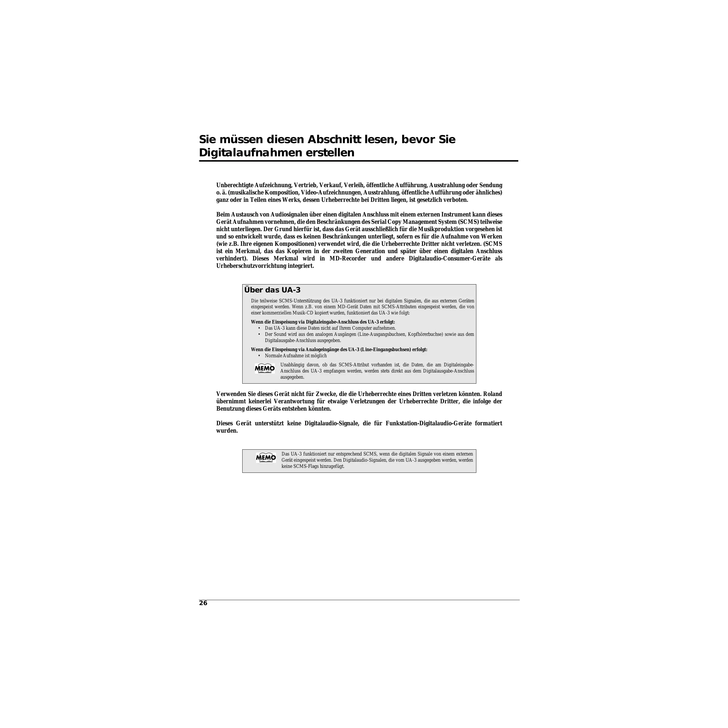 Sie müssen diesen Abschnitt lesen, bevor Sie Digitalaufnahmen erstellen Unberechtigte Aufzeichnung, Vertrieb, Verkauf, Verleih, öffentliche Aufführung, Ausstrahlung oder Sendung o. ä. (musikalische Komposition, Video-Aufzeichnungen, Ausstrahlung, öffentliche Aufführung oder ähnliches) ganz oder in Teilen eines Werks, dessen Urheberrechte bei Dritten liegen, ist gesetzlich verboten. Beim Austausch von Audiosignalen über einen digitalen Anschluss mit einem externen Instrument kann dieses Gerät Aufnahmen vornehmen, die den Beschränkungen des Serial Copy Management System (SCMS) teilweise nicht unterliegen. Der Grund hierfür ist, dass das Gerät ausschließlich für die Musikproduktion vorgesehen ist und so entwickelt wurde, dass es keinen Beschränkungen unterliegt, sofern es für die Aufnahme von Werken (wie z.B. Ihre eigenen Kompositionen) verwendet wird, die die Urheberrechte Dritter nicht verletzen. (SCMS ist ein Merkmal, das das Kopieren in der zweiten Generation und später über einen digitalen Anschluss verhindert). Dieses Merkmal wird in MD-Recorder und andere Digitalaudio-Consumer-Geräte als Urheberschutzvorrichtung integriert. Über das UA-3 Die teilweise SCMS-Unterstützung des UA-3 funktioniert nur bei digitalen Signalen, die aus externen Geräten eingespeist werden. Wenn z.B. von einem MD-Gerät Daten mit SCMS-Attributen eingespeist werden, die von einer kommerziellen Musik-CD kopiert wurden, funktioniert das UA-3 wie folgt: Wenn die Einspeisung via Digitaleingabe-Anschluss des UA-3 erfolgt: