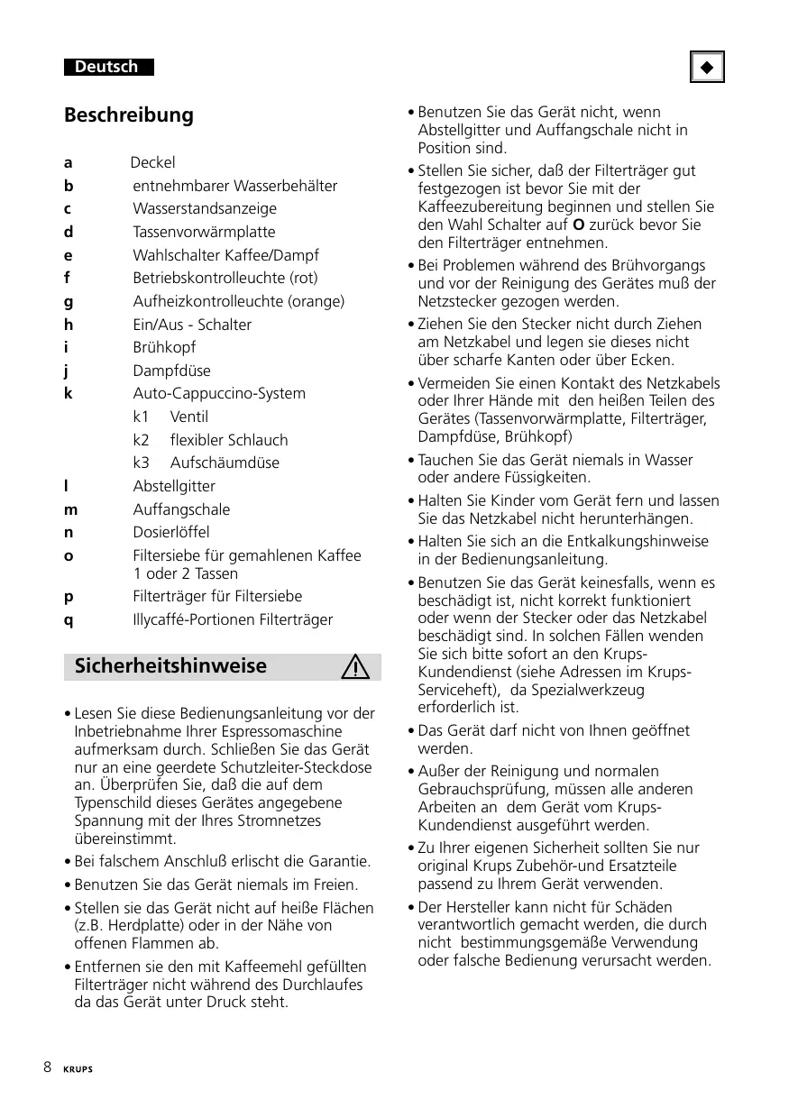 - Zu Ihrer eigenen Sicherheit sollten Sie nur original Krups Zubehör-und Ersatzteile passend zu Ihrem Gerät verwenden.